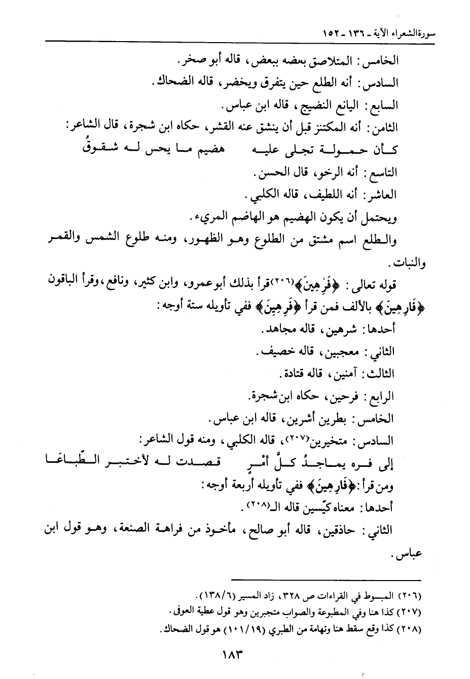 التاسع: أنه الرخو , قال الحسن. العاشر: أنه اللطيف , قاله الكلبي. ويحتمل أن يكون الهضيم هو الهاضم المريء. والطلع اسم مشتق من الطلوع وهو الظهور , ومنه طلوع الشمس والقمر والنبات. قوله تعالى: {فَرِهِينَ} قرأ بذلك أبو عمرو , وابن كثير , ونافع , وقرأ الباقون {فَارِهِينَ} بالألف فمن قرأ {فَرِهِينَ} ففي تأويله ستة أوجه: أحدها: شرهين , قاله مجاهد. الثاني: معجبين , قاله خصيف. الثالث: آمنين , قاله قتادة. الرابع: فرحين , حكاه ابن شجرة. الخامس: بطرين أشرين , قاله ابن عباس. السادس: متخيرين , قاله الكلبي. ومنه قول الشاعر: