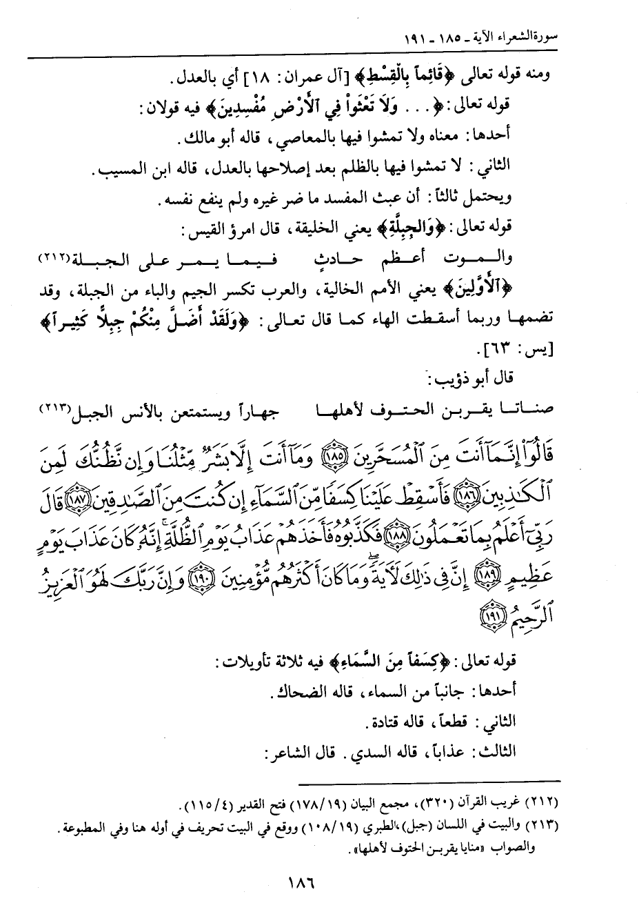 ومنه قوله تعالى: {قَائِماً بِالْقِسْطِ} [آل عمران: 18] أي بالعدل. قوله تعالى: { ... وَلاَ تَعْثَواْ فِي الأَرْضِ مُفْسِدِينَ} فيه قولان: أحدها: معناه ولا تمشوا فيها بالمعاصي , قاله أبو مالك. الثاني: لا تمشوا فيها بالظلم بعد إصلاحها بالعدل , قاله ابن المسيب. ويحتمل ثالثاً: أن عبث المفسد ما ضر غيره ولم ينفع نفسه. قوله تعالى: {وَالجِبِلَّةِ} يعني الخليقة , قال امرؤ القيس:
