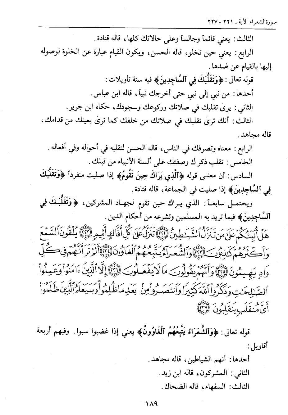 الثالث: يعني قائماً وجالساً وعلى حالاتك كلها , قاله قتادة. الرابع: يعني حين تخلو , قاله الحسن , ويكون القيام عبارة عن الخلوة لوصوله إليها بالقيام عن ضدها. قوله تعالى: {وَتَقَلُّبَكَ فِي السَّاجِدِينَ} فيه ستة تأويلات: أحدها: من نبي إلى نبي حتى أخرجك نبياً , قاله ابن عباس. الثاني: يرى تقلبك في صلاتك وركوعك وسجودك , حكاه ابن جرير. الثالث: أنك ترى تقلبك في صلاتك من خلفك كما ترى بعينك من قدامك , قاله مجاهد. الرابع: معناه وتصرفك في الناس , قاله الحسن لتقلبه في أحواله وفي أفعاله. الخامس: تقلب ذكرك وصفتك على ألسنة الأنبياء من قبلك. السادس: أن معنى قوله {الَّذِي يَرَاكَ حِينَ تَقُومُ} إذا صليت منفرداً {وَتَقَلُّبَكَ فِي السَّاجِدِينَ} إذا صليت في الجماعة , قاله قتادة. ويحتمل سابعاً: الذي يراك حين تقوم لجهاد المشركين , {وَتَقَلُّبَكَ في السَّاجِدِينَ} فيما تريد به المسلمين وتشرعه من أحكام الدين.