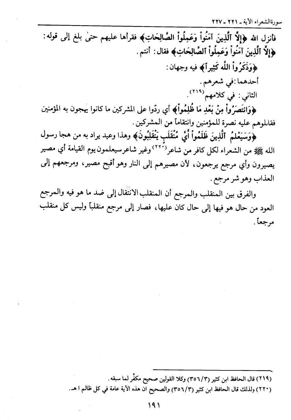 فأنزل الله {إِلاَّ الَّذِينَ آمَنُواْ وَعَمِلُواْ الصَّالِحَاتِ} فقرأها عليهم حتى بلغ إلى قوله: {إِلاَّ الَّذِينَ آمَنُواْ وَعَمِلُواْ الصَّالِحَاتِ} فقال: أنتم. {وَذَكرُواْ اللَّهَ كَثِيراً} فيه وجهان: أحدهما: في شعرهم. الثاني: في كلامهم. {وَانتَصَرُواْ مِنْ بَعْدِ مَا ظُلِمُواْ} أي ردّوا على المشركين ما كانوا يهجون به المؤمنين فقاتلوهم عليه نصرة للمؤمنين وانتقاماً من المشركين. {وَسَيَعْلَمُ الَّذِينَ ظَلَمُواْ أَيَّ مُنْقَلَبٍ يَنْقَلِبُونَ} وهذا وعيد يراد به من هجا رسول الله صلى الله عليه وسلم من الشعراء لكل كافر من شاعر وغير شاعر سيعلمون يوم القيامة أي مصير يصيرون وأي مرجع يرجعون , لأن مصيرهم إلى النار وهو أقبح مصير , ومرجعهم إلى العذاب وهو شر مرجع. والفرق بين المنقلب والمرجع أن المنقلب الانتقال إلى ضد ما هو فيه والمرجع العود من حال هو فيها إلى حال كان عليها , فصارإلى مرجع منقلباً وليس كل منقلب مرجعاً.