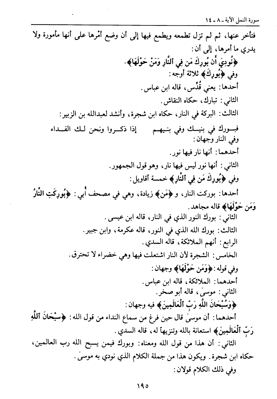 وفي النار وجهان: أحدهما: أنها نار فيها نور. الثاني: أنها نور ليس فيها نار , وهو قول الجمهور. وفي {بُورِكَ مَن فِي النَّارِ} خمسة أقاويل: أحدها: بوركت النار , و {مَن} زيادة , وهي في مصحف أُبي: {بُورِكَتِ النَّارُ وَمَن حَوْلَهَا} قاله مجاهد. الثاني: بورك النور الذي في النار , قاله ابن عيسى. الثالث: بورك الله الذي في النور , قاله عكرمة , وابن جبير. الرابع: أنهم الملائكة , قاله السدي. الخامس: الشجرة لأن النار اشتعلت فيها وهي خضراء لا تحترق. وفي قوله: {وَمَن حَوْلَهَا} وجهان: أحدهما: الملائكة , قاله ابن عباس. الثاني: موسى , قالها أبو صخر. {وَسُبْحَانَ اللَّهِ رَبِّ الْعَالَمِينَ} فيه وجهان: أحدهما: أن موسى قال حين فرغ من سماع النداء من قوله الله: {سبْحَانِ اللَّهِ رَبِّ الْعَالَمِينَ} استعانة بالله وتنزيهاً له , قاله السدي. الثاني: أن هذا من قول الله ومعناه: وبورك فيمن يسبح الله رب العالمين , حكاه ابن شجرة. ويكون هذا من جملة الكلام الذي نودي به موسى. وفي ذلك الكلام قولان: