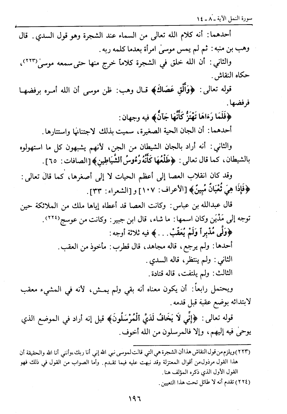 أحدهما: أنه كلام الله تعالى من السماء عند الشجرة وهو قول السدي. قال وهب بن منبه: ثم لم يمس موسى امرأة بعدما كلمه ربه. والثاني: أن الله خلق في الشجرة كلاماً خرج منها حتى سمعه موسى , حكاه النقاش. قوله تعالى: {وَأَلْقِ عَصَاكَ} قال وهب: ظن موسى أن الله أمره برفضها فرفضها. {فَلَمَا رَءَاهَا تَهْتَزُّ كَأَنَّهَا جَآنٌّ} فيه وجهان: أحدهما: أن الجان الحية الصغيرة , سميت بذلك لاجتنانها واستتارها. والثاني: أنه أراد بالجان الشيطان من الجن , لأنهم يشبهون كل ما استهولوه بالشيطان , كما قال تعالى: {طَلْعُهَا كَأَنَّهُ رُءُوسُ الشَّيَاطِينِ} [الصافات: 65]. وقد كان انقلاب العصا إلى أعظم الحيات لا إلى أصغرها , كما قال تعالى: {فَإِذَا هِيَ ثُعْبَانٌ مُبِينٌ} [الأعراف: 107] و [الشعراء: 33]. قال عبد الله بن عباس: وكانت العصا قد أعطاه إياها ملك من الملائكة حين توجه إلى مَدْيَن وكان اسمها: ما شاء , قال ابن جبير: وكانت من عوسج. {وَلَّى مُدْبِراً وَلَمْ يُعَقّبْ ... } فيه ثلاثة أوجه: أحدها: ولم يرجع , قاله مجاهد , قال قطرب: مأخوذ من العقب. الثاني: ولم ينتظر , قاله السدي. الثالث: ولم يلتفت , قاله قتادة. ويحتمل رابعاً: أن يكون معناه أنه بقي ولم يمش , لأنه في المشيء معقب لابتدائه بوضع عقبة قبل قدمه. قوله تعالى: {إِنِّي لاَ يَخَافُ لَدَيَّ الْمُرْسَلُونَ} قيل إنه أراد في الموضع الذي يوحى فيه إليهم , ولا فالمرسلون من الله أخوف.