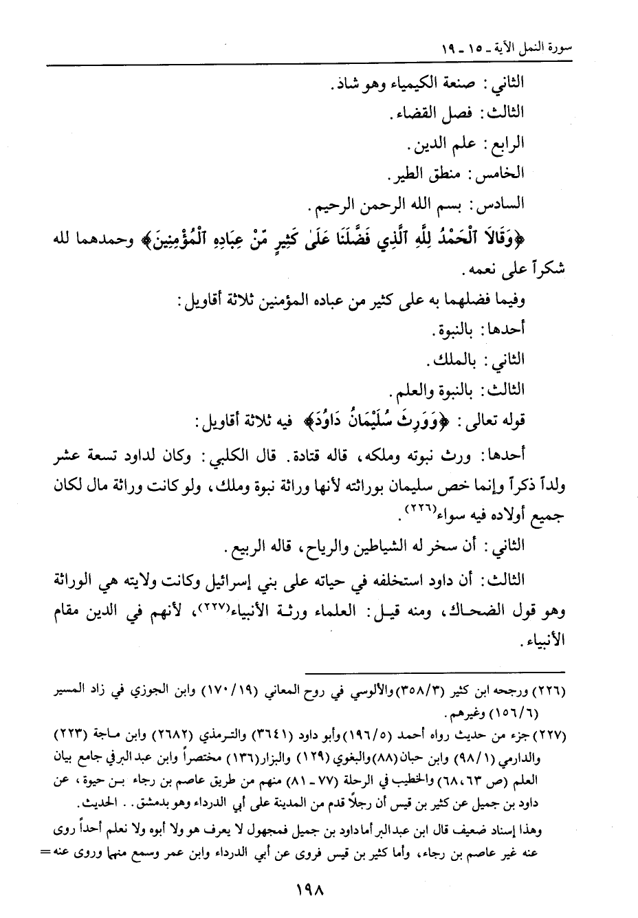 الثاني: صنعة الكيمياء وهو شاذ. الثالث: فصل القضاء. الرابع: علم الدين. الخامس: منطق الطير. السادس: بسم الله الرحمن الرحيم. {وَقَالاَ الْحَمْدُ الَّذِي فَضَّلَنَا عَلَى كَثِيرٍ مّنْ عِبَادِهِ الْمُؤْمِنِينَ} وحمدهما لله شكراً على نعمه. وفيما فضلهما به على كثير من عباده المؤمنين ثلاثة أقاويل: أحدها: بالنبوة. الثاني: بالملك. الثالث: بالنبوة والعلم. قوله تعالى: {ووَرِثَ سُلَيْمَانُ دَاوُدَ} فيه ثلاثة أقاويل: أحدها: ورث نبوته وملكه , قاله قتادة , قال الكلبي: وكان لداود تسعة عشر ولداً ذكراً وإنما خص سليمان بوراثتة لأنها وراثة نبوة وملك , ولو كانت وراثة مال لكان جميع أولاده فيه سواء. الثاني: أن سخر له الشياطين والرياح , قاله الربيع. الثالث: أن داود استخلفه في حياته على بني إسرائيل وكانت ولايته هي الوراثة وهو قول الضحاك، ومنه قيل: العلماء ورثة الأنبياء، لأنهم في الدين مقام الأنبياء.