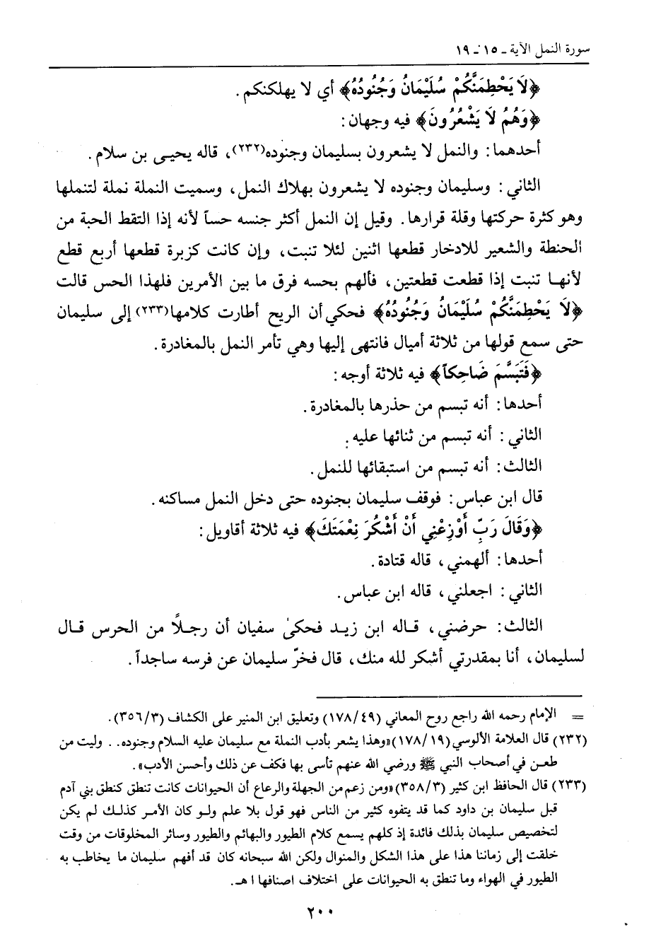 {لاَ يَحْطِمَنَّكُمْ سُلَيْمَانُ وَجُنُودُهُ} أي لا يهلكنكم. {وَهُمُ لاَ يَشعُرُونَ} فيه وجهان: أحدهما: والنمل لا يشعرون بسليمان وجنوده , قاله يحيى بن سلام. الثاني: وسليمان وجنوده لا يشعرون بهلاك النمل , وسميت النملة نملة لتنملها وهو كثرة حركتها وقلة قرارها , وقيل إن النمل أكثر جنسه حساً لأنه إذا التقط الحبة من الحنطة والشعير للادخار قطعها اثنين لئلا تنبت , وإن كانت كزبرة قطعها أربع قطع {لاَ يَحْطِمَنَّكُمْ سُلَيْمَانُ وَجُنُودُهُ} فحكي أن الريح أطارت كلامها إلى سليمان حتى سمع قولها من ثلاثة أميال فانتهى إليها وهي تأمر النمل بالمغادرة. {فَتَبَسَّمَ ضَاحِكاً} فيه ثلاثة أوجه: أحدها: أنه تبسم من حذرها بالمغادرة. الثاني: أنه تبسم من ثنائها عليه. الثالث: أنه تبسم من استبقائها للنمل. قال ابن عباس: فوقف سليمان بجنوده حتى دخل النمل مساكنه. {وَقَالَ رَبِّ أَوْزِعْنِي أنْ أَشْكُرَ نِعْمَتَكَ} فيه ثلاثة أقاويل: أحدها: ألهمني , قاله قتادة. الثاني: اجعلني , قاله ابن عباس. الثالث: حرضني , قاله ابن زيد فحكى سفيان أن رجلاً من الحرس قال لسليمان , أنا بمقدرتي أشكر لله منك , قال فخرّ سليمان عن فرسه ساجداً.