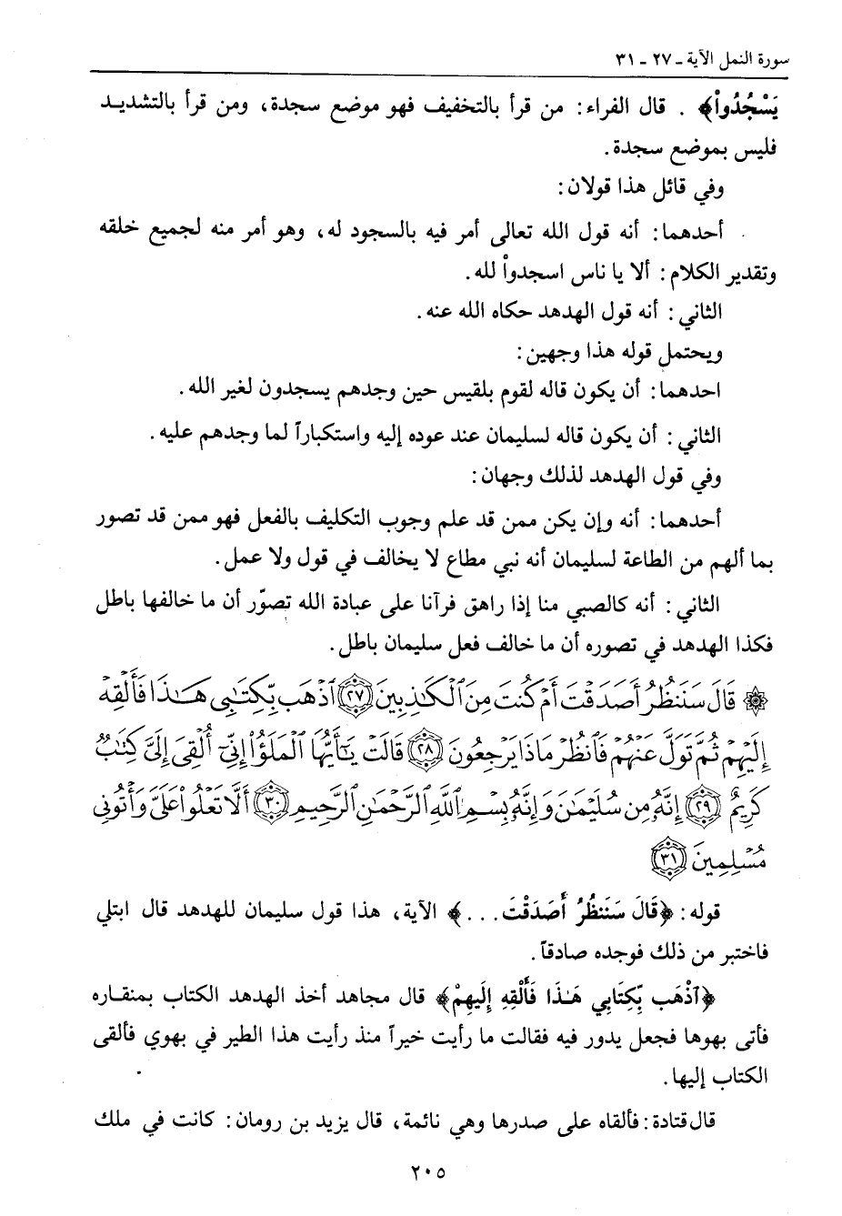 {قال سننظر أصدقت أم كنت من الكاذبين اذهب بكتابي هذا فألقه إليهم ثم تول عنهم فانظر ماذا يرجعون قالت يا أيها الملأ إني ألقي إلي كتاب كريم إنه من سليمان وإنه بسم الله الرحمن الرحيم ألا تعلوا علي وأتوني مسلمين} قوله: {قَالَ سَنَنظُرُ أَصَدَقْتَ ... } الآية , هذا قول سليمان للهدهد قال ابتلي فاختبر من ذلك فوجده صادقاً. {اذْهَبِ بِّكِتَابِي هَذَا إِلَيهِمْ} قال مجاهد أخذ الهدهد الكتاب بمنقاره فأتى بهوها فجعل يدور فيه فقالت ما رأيت خيراً منذ رأيت هذا الطير في بهوي فألقى الكتاب إليها. قال قتادة: فألقاه على صدرها وهي نائمة , قال يزيد بن رومان: كانت في ملك