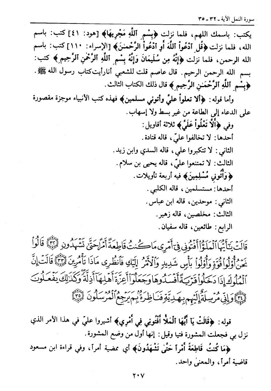 يكتب: باسمك الله , فلما نزلت {بِسْمِ اللَّهِ مَجْرِيهَا} [هود: 41] كتب: باسم الله , فلما نزلت {قُلِ ادْعُواْ اللَّهَ أَوِ ادْعُواْ الرَّحْمَنَ} [الإِسراء: 110] كتب: باسم الله الرحمن , فلما نزلت {إِنَّهُ مِن سُلَيمَانَ وَإِنَّهُ بِسْمِ اللَّهِ الرَّحْمنِ الرَّحِيمِ} كتب: بسم الله الرحمن الرحيم. قال عاصم قلت للشعبي أنا رأيت كتاب رسول الله صلى الله عليه وسلم. {بِسْمِ اللَّهِ الرَّحْمَنِ الرَّحِيمِ} قال ذلك الكتاب الثالث. وأما قوله: {ألا تعلواْ عليَّ وأتوني مسلمين} فهذه كتب الأنباء موجزة مقصورة على الدعاء إلى الطاعة من غير بسط ولا إٍسهاب. وفي {أَلاَّ تَعْلُواْ عَلَيَّ} ثلاثة أقاويل: أحدها: لا تخالفوا عليّ , قاله قتادة. الثاني: لا تتكبروا علي , قاله السدي وابن زيد. الثالث: لا تمتنعوا عليّ , قاله يحيى بن سلام. {وَأْتُونِي مُسْلِمِينَ} فيه أربعة تأويلات: أحدها: مستسلمين , قاله الكلبي. الثاني: موحدين , قاله ابن عباس. الثالث: مخلصين , قاله زهير. الرابع: طائعين , قاله سفيان.