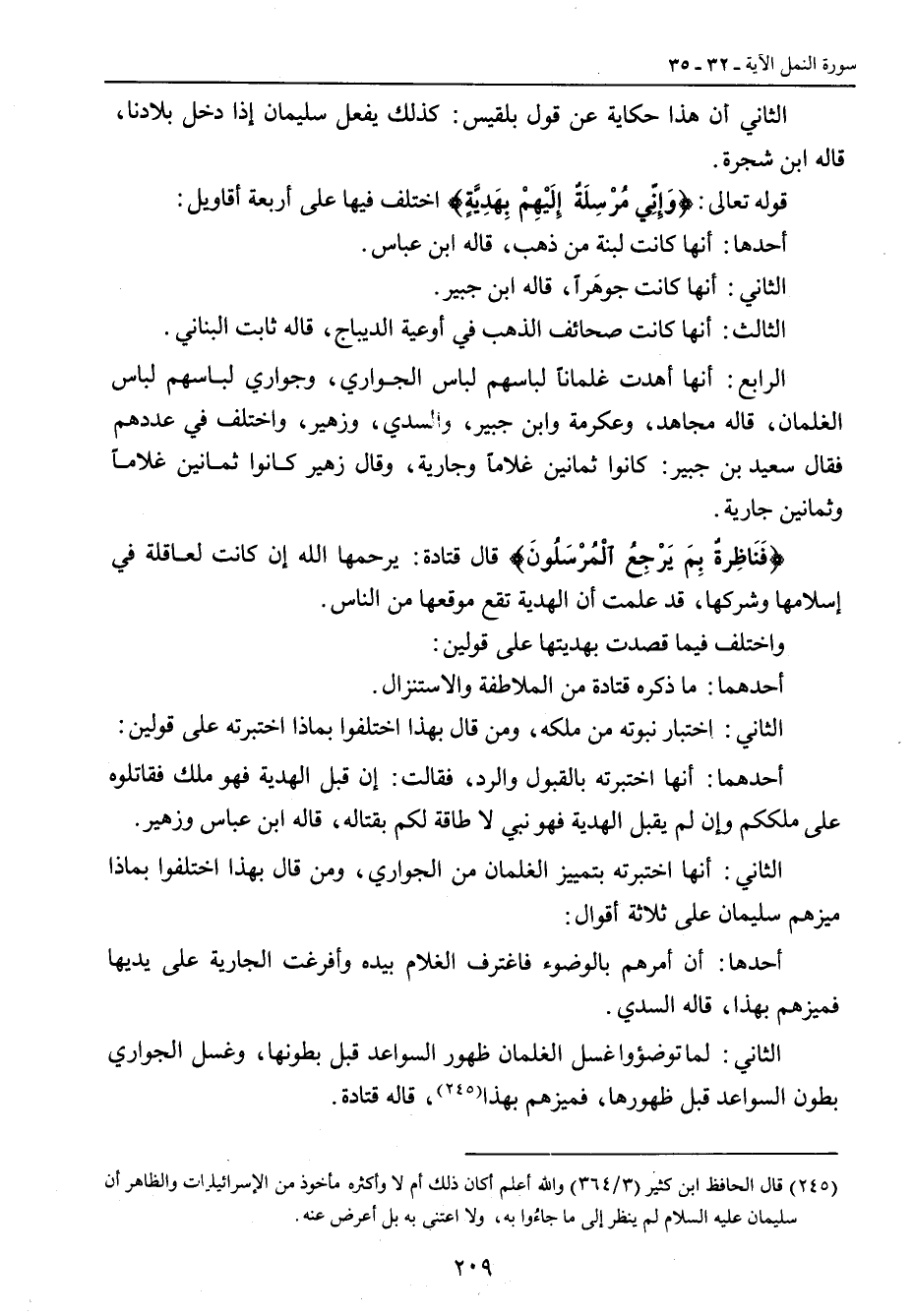 الثاني أن هذا حكاية عن قول بلقيس: كذلك يفعل سليمان إذا دخل بلادنا , قاله ابن شجرة. قوله تعالى: {وَإِنِّي مُرْسِلَةٌ إِلَيْهِمْ بِهَدِيَّةٍ} اختلف فيها على أربعة فيها على أربعة أقاويل: أحدها: أنها كانت لبنة من ذهب , قاله ابن عباس. الثاني: أنها كانت جوهَراً , قاله ابن جبير. الثالث: أنها كانت صحائف الذهب في أوعية الديباج , قاله ثابت البناني. الرابع: أنها أهدت غلماناً لباسهم لباس الجواري , وجواري لباسهم لباس الغلمان , قاله مجاهد , وعكرمة وابن جبير , والسدي , وزهير , واختلف في عددهم فقال سعيد بن جبير: كانوا ثمانين غلاماً وجارية , وقال زهير كانوا ثمانين غلاماً وثمانين جارية. {فَنَاظِرةٌ بِمَ يَرْجِعُ الْمُرْسَلُونَ} قال قتادة: يرحمها الله إن كانت لعاقلة في إسلامها وشركها , قد علمت أن الهدية تقع موقعها من الناس. واختلف فيما قصدت بهديتها على قولين: أحدهما: ما ذكره قتادة من الملاطفة والاستنزال. الثاني: اختبار نبوته من ملكه , ومن قال بهذا اختلفوا بماذا اختبرته على قولين: أحدهما: أنها اختبرته بالقبول والرد , فقالت: إن قبل الهدية فهو ملك فقاتلوه على ملككم وإن لم يقبل الهدية فهو نبي لا طاقة لكم بقتاله , قاله ابن عباس وزهير. الثاني: أنها اختبرته بتمييز الغلمان من الجواري , ومن قال بهذا اختلفوا بماذا ميزهم سليمان عل ثلاثة أقوال. أحدها: أن أمرهم بالوضوء فاغترف الغلام بيده وأفرغت الجارية على يديها فميزهم بهذا، قاله السدي. الثاني: لما توضؤوا غسل الغلمان ظهور السواعد قبل بطونها , وغسل الجواري بطون السواعد قبل ظهورها، فميزهم بهذا، قاله قتادة.