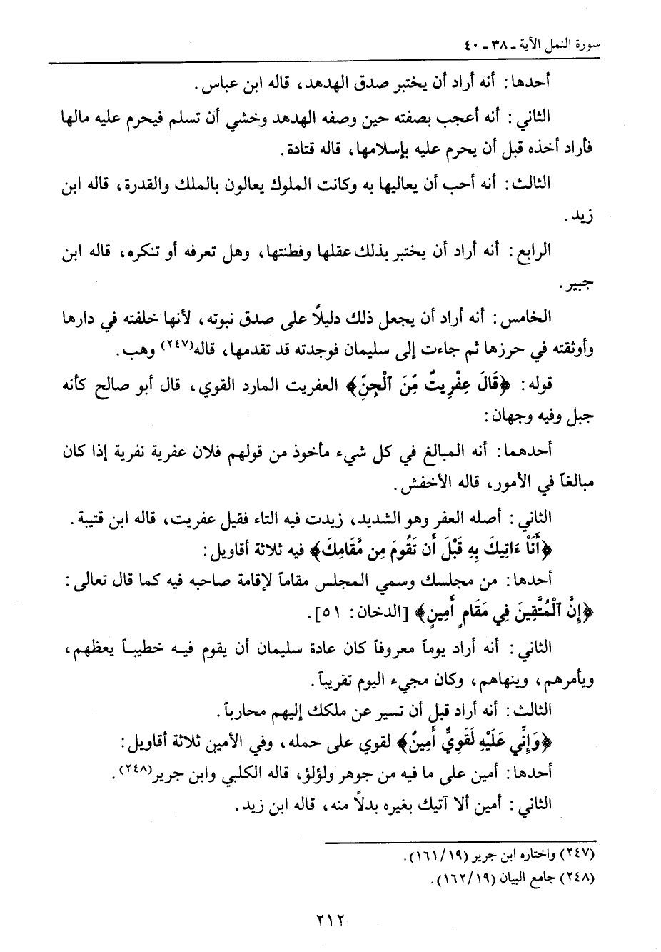 أحدها: أنه أراد أن يختبر صدق الهدهد , قاله ابن عباس. الثاني: أنه أعجب بصفته حين وصفه الهدهد وخشي أن تسلم فيحرم عليه مالها فأراد أخذه قبل أن يحرم عليه بإسلامها , قاله قتادة. الثالث: أنه أحب أن يعاليها به وكانت الملوك يعالون بالملك والقدرة , قاله ابن زيد. الرابع: أنه أراد أن يختبر بذلك عقلها وفطنتها , وهل تعرفه أو تنكره , قاله ابن جبير. الخامس: أنه أراد أن يجعل ذلك دليلاً على صدق نبوته , لأنها خلفته في دارها وأوثقته في حرزها ثم جاءت إلى سليمان فوجدته قد تقدمها , قاله وهب. قوله: {قَالَ عِفْرِيتٌ مِّنَ الْجِنِّ} العفريت المارد القوي , قال أبو صالح كأنه جبل وفيه وجهان: أحدهما: أنه المبالغ في كل شيء مأخوذ من قولهم فلان عفرية نفرية إذا كان مبالغاً في الأمور , قاله الأخفش. الثاني: أصله العفر وهو الشديد , زيدت فيه التاء فقيل عفريت , قاله ابن قتيبة. {أَنَاْ ءاتِيكَ بِهِ قَبْلَ أَن تَقُومَ مِن مَّقَامِكَ} فيه ثلاثة أقاويل: أحدها: من مجلسك وسمي المجلس مقاماً لإقامة صاحبه فيه كما قال تعالى: {إِنَّ الْمُتَّقِينَ فِي مَقَامٍ أَمِينٍ} [الدخان: 51]. الثاني: أنه أراد يوماً معروفاً كان عادة سليمان أن يقوم فيه خطيباً يعظهم , ويأمرهم , وينهاهم , وكان مجيء اليوم تقريباً. الثالث: أنه أراد قبل أن تسير عن ملكك إليهم محارباً. {وَإِنِّي عَلَيْهِ لَقَوِيٌّ أَمِينٌ} لقوي على حمله , وفي الأمين ثلاثة أقاويل: أحدها: أمين على ما فيه من جوهر ولؤلؤ , قاله الكلبي وابن جرير. الثاني: أمين ألا آتيك بغيره بدلاً منه، قاله ابن زيد.