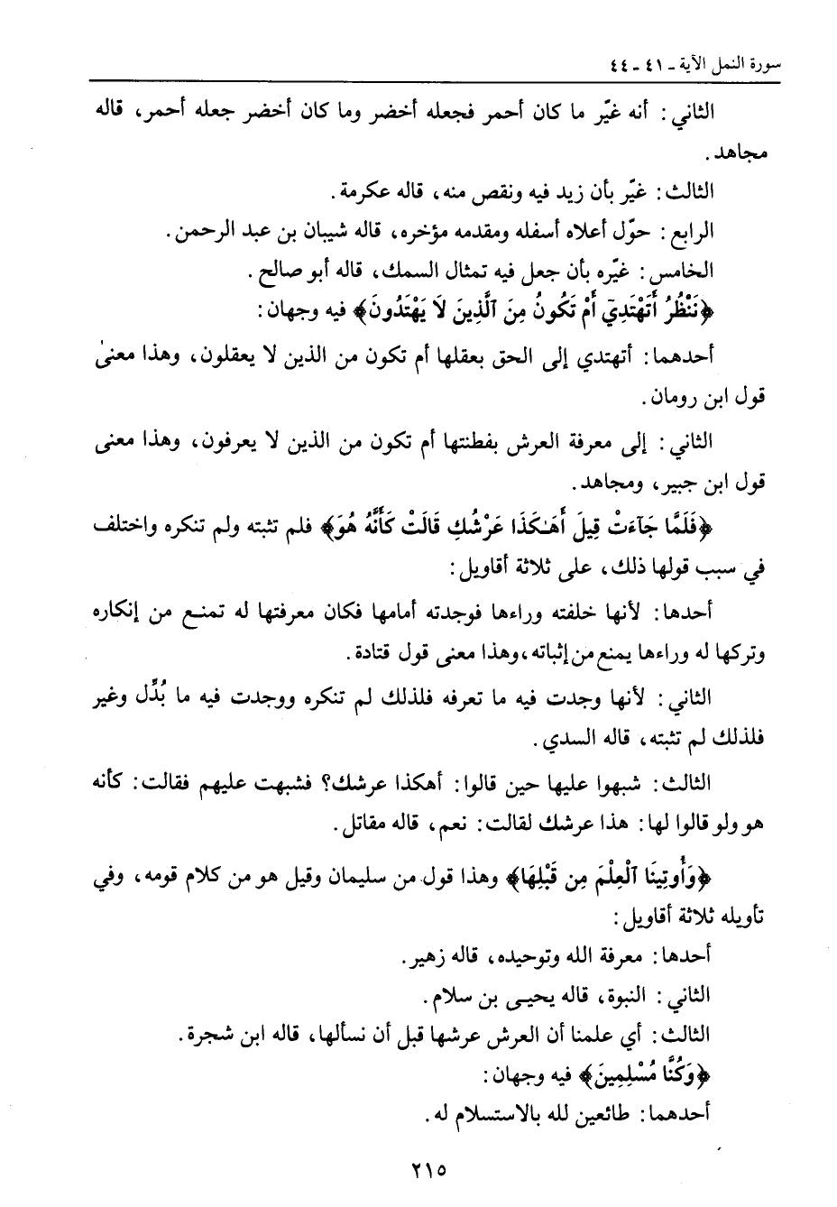 الثاني: أنه غيّر ما كان أحمر فجعله أخضر وما كان أخضر جعله أحمر , قاله مجاهد. الثالث: غيّر بأن زيد فيه ونقص منه , قاله عكرمة. الرابع: حوّل أعلاه أسفله ومقدمه مؤخره، قاله شيبان بن عبد الرحمن. الخامس: غيّره بأن جعل فيه تمثال السمك , قاله أبو صالح. {نَنْظُرُ أَتَهْتَدِي أَمْ تَكُونُ مِنَ الَّذِينَ لاَ يَهْتَدُونَ} فيه وجهان: أحدهما: أتهتدي إلى الحق بعقلها أم تكون من الذين لا يعقلون , وهذا معنى قول ابن رومان. الثاني: إلى معرفة العرش بفطنتها أم تكون من الذين لا يعرفون , وهذا معنى قول ابن جبير , ومجاهد. {فَلَمَّا جَآءَتْ قِيلَ أَهَكَذَا عَرْشُكِ قَالَتْ كَأَنَّهُ هُوَ} فلم تثبته ولم تنكره واختلف في سبب قولها ذلك , على ثلاثة أقاويل: أحدها: لأنها خلفته وراءها فوجدته أمامها فكان معرفتها له تمنع من إنكاره وتركها له وراءها يمنع إثباته , وهذا معنى قول قتادة. الثاني: لأنها وجدت فيه ما تعرفه فلذلك لم تنكره ووجدت فيه ما بُدِّل وغير فلذلك لم تثبته , قاله السدي. الثالث: شبهوا عليها حين قالوا: أهكذا عرشك؟ فشبهت عليهم فقالت: كأنه هو ولو قالوا لها: هذا عرشك لقالت: نعم , قاله مقاتل. {وَأُوَتِينَا الْعِلْمَ مِن قَبْلِهَا} وهذا قول من سليمان وقيل هو من كلام قومه , وفي تأويله ثلاثة أقاويل: أحدها: معرفة الله وتوحيده , قاله زهير. الثاني: النبوة , قاله يحيى بن سلام. الثالث: أي علمنا أن العرش عرشها قبل أن نسألها , قاله ابن شجرة. {وَكُنَّا مُسْلِمِينَ} فيه وجهان: أحدهما: طائعين لله بالاستسلام له.