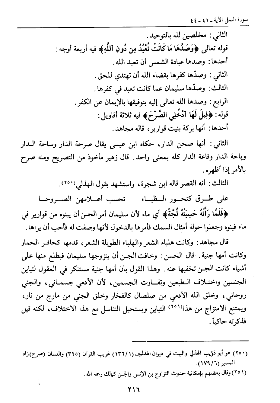 الثاني: مخلصين لله بالتوحيد. قوله تعالى {وَصَدَّهَا مَا كَانَتْ تَّعْبُدُ مِن دُونِ اللَّهِ} فيه أربعة أوجه: أحدها: وصدها عبادة الشمس أن تعبد الله. الثاني: وصدّها كفرها بقضاء الله أن تهتدي للحق. الثالث: وصدّها سليمان عما كانت تعبد في كفرها. الرابع: وصدها الله تعالى إليه بتوفيقها بالإيمان عن الكفر. قوله: {قِيلَ لَهَا ادْخُلِي الصَّرْحَ} فيه ثلاثة أقاويل: أحدها: أنها بركة بنيت قوارير , قاله مجاهد. الثاني: أنها صحن الدار , حكاه ابن عيسى يقال صرحة الدار وساحة الدار وباحة الدار وقاعة الدار كله بمعنى واحد. قال زهير مأخوذ من التصريح ومنه صرح بالأمر إذا أظهره. الثالث: أنه القصر قاله ابن شجرة , واستشهد بقول الهذلي.