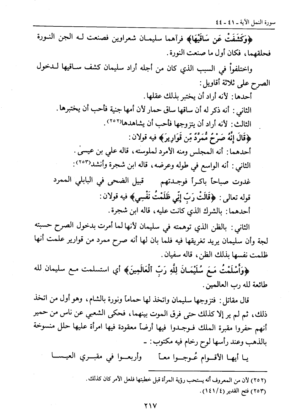 {وَكَشَفَتْ عَن سَاقَيْهَا} فرآهما سليمان شعراوين فصنعت له الجن النورة فحلقهما , فكان أول من صنعت النورة. واختلفواْ في السبب الذي كان من أجله أراد سليمان كشف ساقيها لدخول الصرح على ثلاثة أقاويل: أحدها: لأنه أراد أن يختبر بذلك عقلها. الثاني: أنه ذكر له أن ساقها ساق حمار لأن أمها جنية فأحب أن يختبرها. الثالث: لأنه أراد أن يتزوجها فأحب أن يشاهدها. {قَالَ إِنَّهُ صَرْحٌ مُّمَرَّدٌ مِّن قَوَارِيرَ} فيه قولان: أحدهما: أنه المجلس ومنه الأمرد لملوسته , قاله علي بن عيسى. الثاني: أنه الواسع طوله وعرضه , قاله ابن شجرة وأنشد: