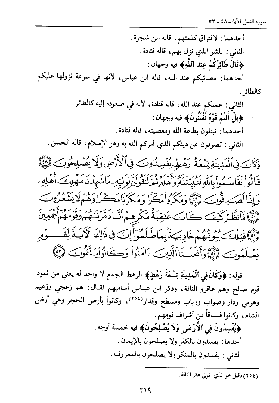 {وكان في المدينة تسعة رهط يفسدون في الأرض ولا يصلحون قالوا تقاسموا بالله لنبيتنه وأهله ثم لنقولن لوليه ما شهدنا مهلك أهله وإنا لصادقون ومكروا مكرا ومكرنا مكرا وهم لا يشعرون فانظر كيف كان عاقبة مكرهم أنا دمرناهم وقومهم أجمعين فتلك بيوتهم خاوية بما ظلموا إن في ذلك لآية لقوم يعلمون وأنجينا الذين آمنوا وكانوا يتقون} قوله: {وَكَانَ فِي الْمَدِينَةِ تِسْعَةُ رَهْطٍ} الرهط الجمع لا واحد له يعني من ثمود قوم صالح وهم عاقرو الناقة , وذكر ابن عباس أساميهم فقال: هم زعجي وزعيم وهرمي ودار وصواب ورباب ومسطح وقدار , وكانواْ بأرض الحجر وهي أرض الشام , وكانوا فساقاً من أشراف قومهم. {يُفْسِدُونَ فِي الأَرْضِ وَلاَ يُصْلِحُونَ} فيه خمسة أوجه: أحدها: يفسدون بالكفر ولا يصلحون بالإيمان. الثاني: يفسدون بالمنكر ولا يصلحون بالمعروف.