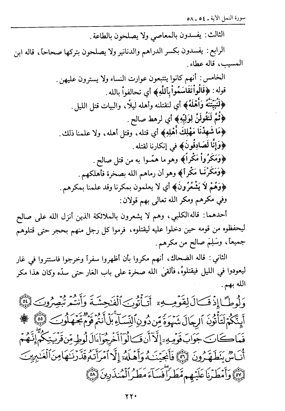 الثالث: يفسدون بالمعاصي ولا يصلحون بالطاعة. الرابع: يفسدون بكسر الدراهم والدنانير ولا يصلحون بتركها صحاحاً , قاله ابن المسيب , قاله عطاء. الخامس: أنهم كانوا يتتبعون عورات النساء ولا يسترون عليهن. قوله: {قَالُواْ تَقَاسَمُوا بِاللَّهِ} أي تحالفواْ بالله. {لَنُبَيِّتَنَّهُ وَأَهْلَهُ} أي لنقتلنه وأهله ليلاً , والبيات قتل الليل. {ثُمَّ لَنَقُولَنَّ لِوَلِيِّهِ} أي لرهط صالح. {مَا شَهِدْنَا مَهْلِكَ أَهْلِهِ} أي قتله , وقتل أهله , ولا علمنا ذلك. {وَإِنَّا لَصّادِقُونَ} في إنكارنا لقتله. {وَمَكَرُواْ مَكْراً} وهو ما همّوا به من قتل صالح. {وَمَكَرْنَا مَكْراً} وهو أن رماهم الله بصخرة فأهلكهم. {وَهُمْ لاَ يَشْعُرُونَ} أي لا يعلمون بمكرنا وقد علمنا بمكرهم. وفي مكرهم ومكر الله تعالى بهم قولان: أحدهما: قاله الكلبي , وهم لا يشعرون بالملائكة الذين أنزل الله على صالح ليحفظوه من قومه حين دخلوا عليه ليقتلوه , فرموا كل رجل منهم بحجر حتى قتلوهم جميعاً , وسَلِمَ صالح من مكرهم. الثاني: قاله الضحاك , أنهم مكروا بأن أظهروا سفراً وخرجوا فاستتروا في غار ليعودوا في الليل فيقتلوهُ , فألقى الله صخرة على باب الغار حتى سدّه وكان هذا مكر الله بهم.