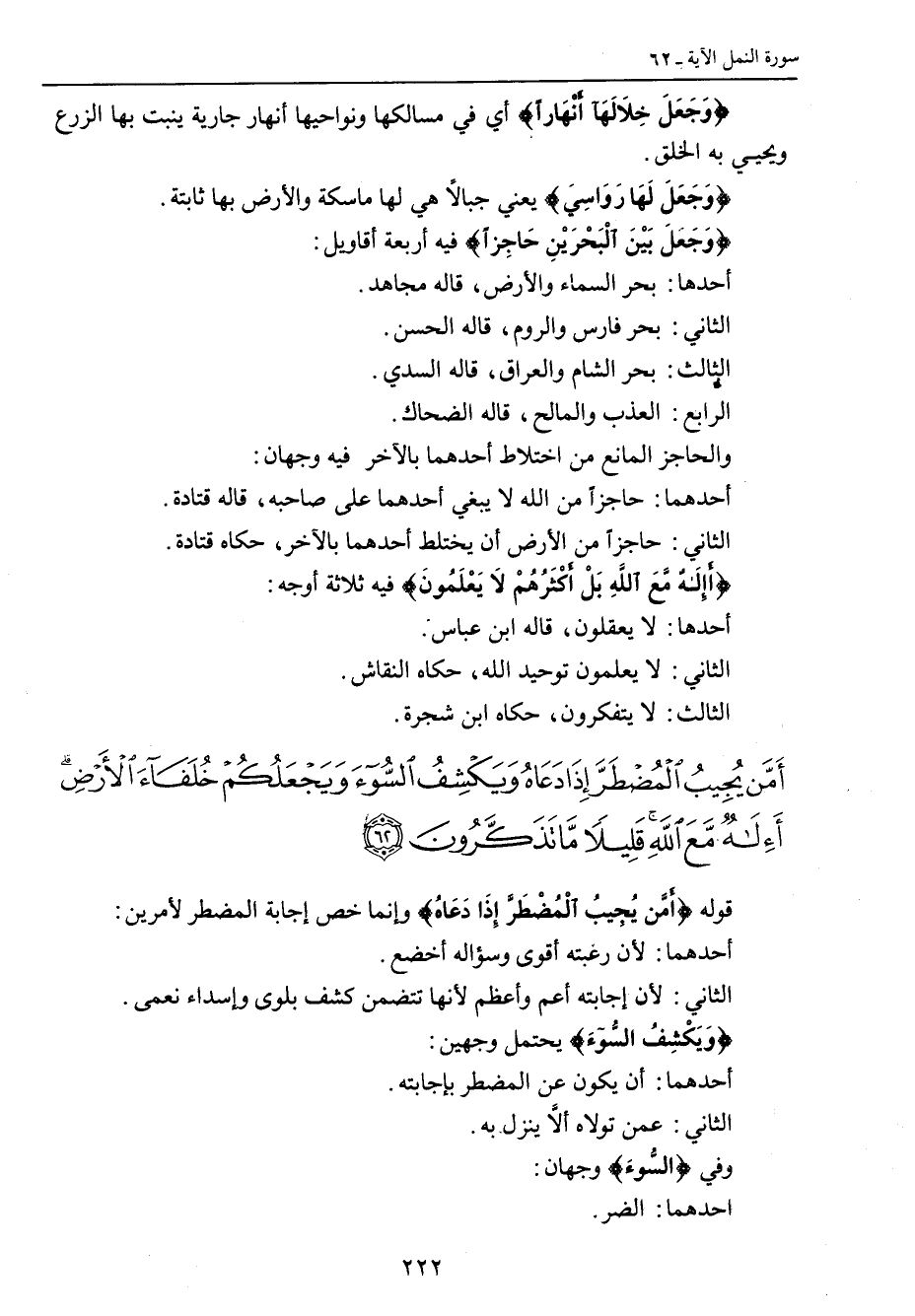 {وَجَعَلَ خِلاَلَهَآ أَنْهَاراً} أي في مسالكها ونواحيها أنهار جارية ينبت بها الزرع ويحيي به الخلق. {وَجَعَلَ لَهَا رَوَاسِيَ} يعني جبالاً هي لها ماسكة والأرض بها ثابتة. {وَجَعَلَ بَيْنَ الْبَحْرَينِ حَاجِزاً} فيه أربعة أقاويل: أحدها: بحر السماء والأرض , قاله مجاهد. الثاني: بحر فارس والروم , قاله الحسن. الثالث: بحر الشام والعراق , قاله السدي. الرابع: العذب والمالح , قاله الضحاك. والحاجز المانع من اختلاط أحدهما بالآخر فيه وجهان: أحدهما: حاجزاً من الله لا يبغي أحدهما على صاحبه , قاله قتادة. الثاني: حاجزاً من الأرض أن يختلط أحدهما بالآخر , حكاه قتادة. {أَإِلَهٌ مَّعَ اللَّهِ بَلْ أَكْثَرُهُمْ لاَ يَعْلَمُونَ} فيه ثلاثة أوجه: أحدها: لا يعقلون , قاله ابن عباس. الثاني: لا يعلمون توحيد الله , حكاه النقاش. الثالث: لا يتفكرون , حكاه ابن شجرة.