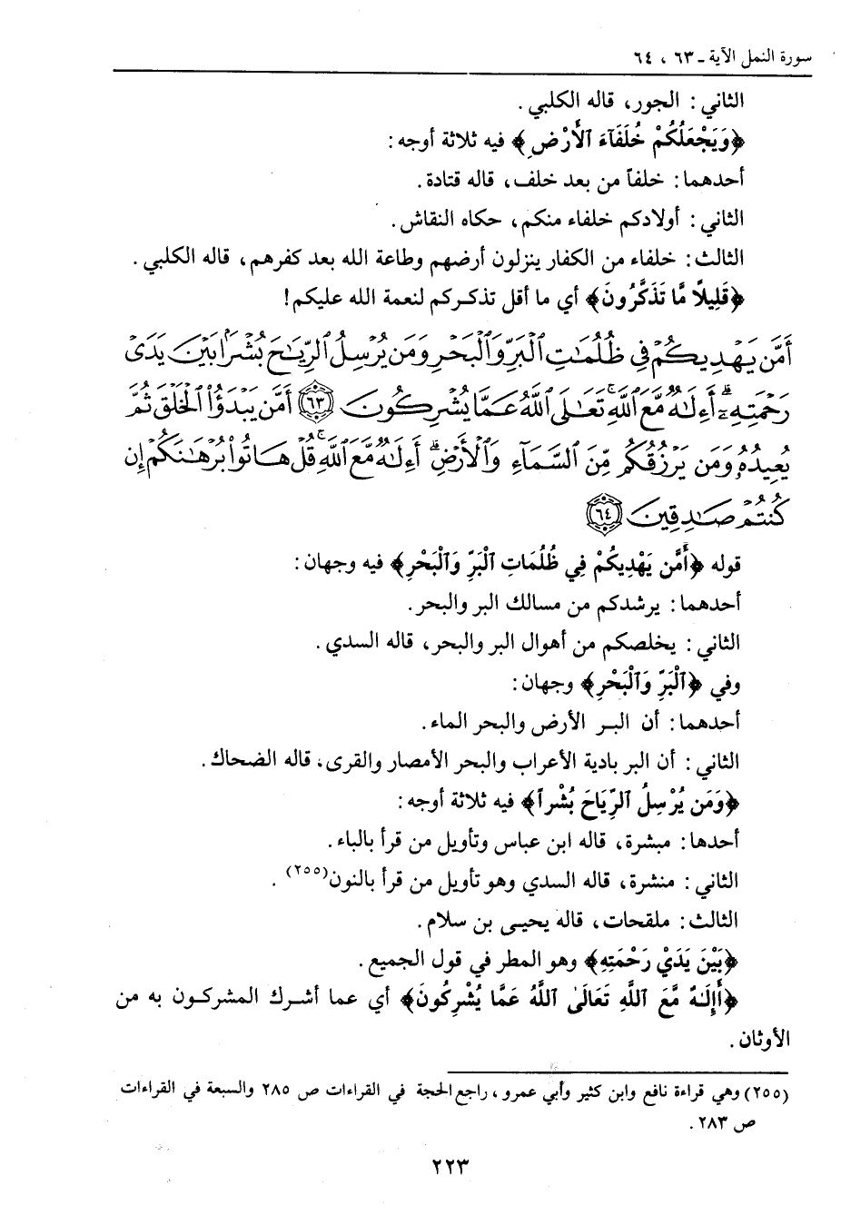 {أم من يهديكم في ظلمات البر والبحر ومن يرسل الرياح بشرا بين يدي رحمته أإله مع الله تعالى الله عما يشركون أم من يبدأ الخلق ثم يعيده ومن يرزقكم من السماء والأرض أإله مع الله قل هاتوا برهانكم إن كنتم صادقين} قوله {أَمَّن يَهْدِيكُمْ فِي ظُلُمَاتِ الْبَرَّ وَالْبَحْرِ} فيه وجهان: أحدهما: يرشدكم من مسالك البر والبحر. الثاني: يخلصكم من أهوال البر والبحر , قاله السدي. وفي {الْبَرِّ وَالْبَحْرِ} وجهان: أحدهما: أن البر الأرض والبحر الماء. الثاني: أن البر بادية الأعراب والبحر الأمصار والقرى , قاله الضحاك. {وَمَن يُرْسِلُ الرِّيَاحَ بُشْراً} فيه ثلاثة أوجه: أحدها: مبشرة , قاله ابن عباس وتأويل من قرأ بالباء. الثاني: منشرة , قاله السدي وهو تأويل من قرأ بالنون. الثالث: ملقحات , قاله يحيى بن سلام. {بَيْنَ يَدَيْ رَحْمَتِهِ} وهو المطر في قول الجميع. {أَإِلَهٌ مَّعَ اللَّهِ تَعَالَى اللَّهُ عَمَّا يُشْرِكُونَ} أي عما أشرك المشركون به من الأوثان.