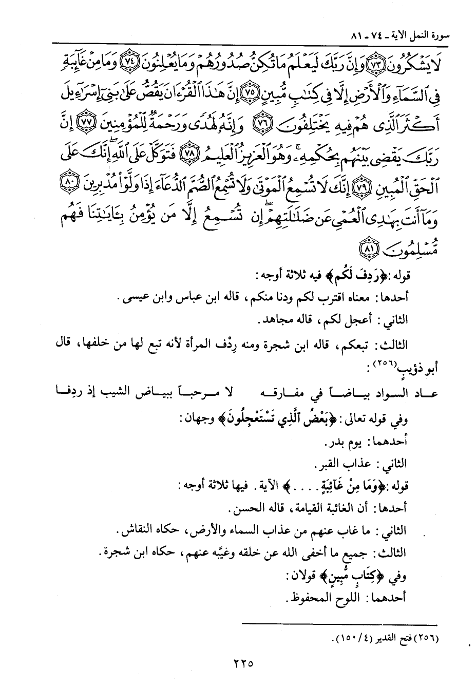 لا يشكرون وإن ربك ليعلم ما تكن صدورهم وما يعلنون وما من غائبة في السماء والأرض إلا في كتاب مبين إن هذا القرآن يقص على بني إسرائيل أكثر الذي هم فيه يختلفون وإنه لهدى ورحمة للمؤمنين إن ربك يقضي بينهم بحكمه وهو العزيز العليم فتوكل على الله إنك على الحق المبين إنك لا تسمع الموتى ولا تسمع الصم الدعاء إذا ولوا مدبرين وما أنت بهادي العمي عن ضلالتهم إن تسمع إلا من يؤمن بآياتنا فهم مسلمون} قوله: {رَدِفَ لَكُم} فيه ثلاثة أوجه: أحدها: معناه اقترب لكم ودنا منكم: قاله ابن عباس وابن عيسى. الثاني: أعجل لكم , قاله مجاهد. الثالث: تبعكم , قاله ابن شجرة ومنه رِدْف المرأة لأنه تبع لها من خلفها، قال أبو ذؤيبٍ: