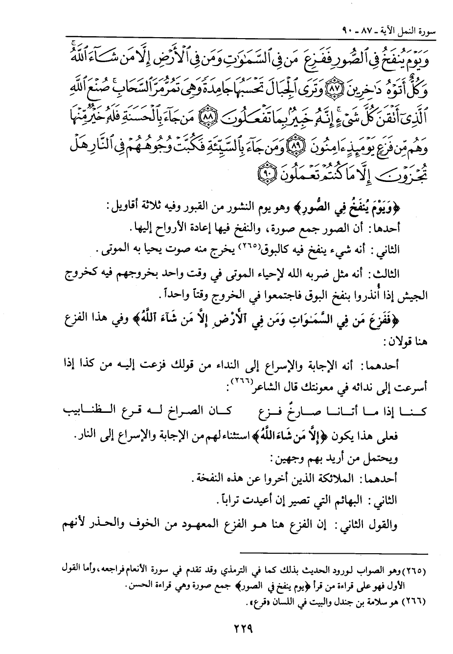 {ويوم ينفخ في الصور ففزع من في السماوات ومن في الأرض إلا من شاء الله وكل أتوه داخرين وترى الجبال تحسبها جامدة وهي تمر مر السحاب صنع الله الذي أتقن كل شيء إنه خبير بما تفعلون من جاء بالحسنة فله خير منها وهم من فزع يومئذ آمنون ومن جاء بالسيئة فكبت وجوههم في النار هل تجزون إلا ما كنتم تعملون} {وَيَوْمَ يُنفَخُ فِي الصُّورِ} وهو يوم النشور من القبور وفيه ثلاثة أقاويل: أحدها: أن الصور جمع صورة , والنفخ فيها إعادة الأرواح إليها. الثاني: أنه شيء ينفخ فيه كالبوق يخرج منه صوت يحيا بن الموتى. الثالث: أنه مثل ضربه الله لإحياء الموتى في وقت واحد بخروجهم فيه كخروج الجيش إذا أُنذروا بنفخ البوق فاجتمعوا في الخروج وقتاً واحداً. {فَفَزِعَ مَن فِي السَّمَوَاتِ وَمَن فِي الأَرْضِ إِلاَّ مَن شَآءَ اللَّهُ} وفي هذا الفزع هنا قولان: أحدهما: أنه الإجابة والإسراع إلى النداء من قولك فزعت إليه من كذا إذا أسرعت إلى ندائه في معونتك قال الشاعر: