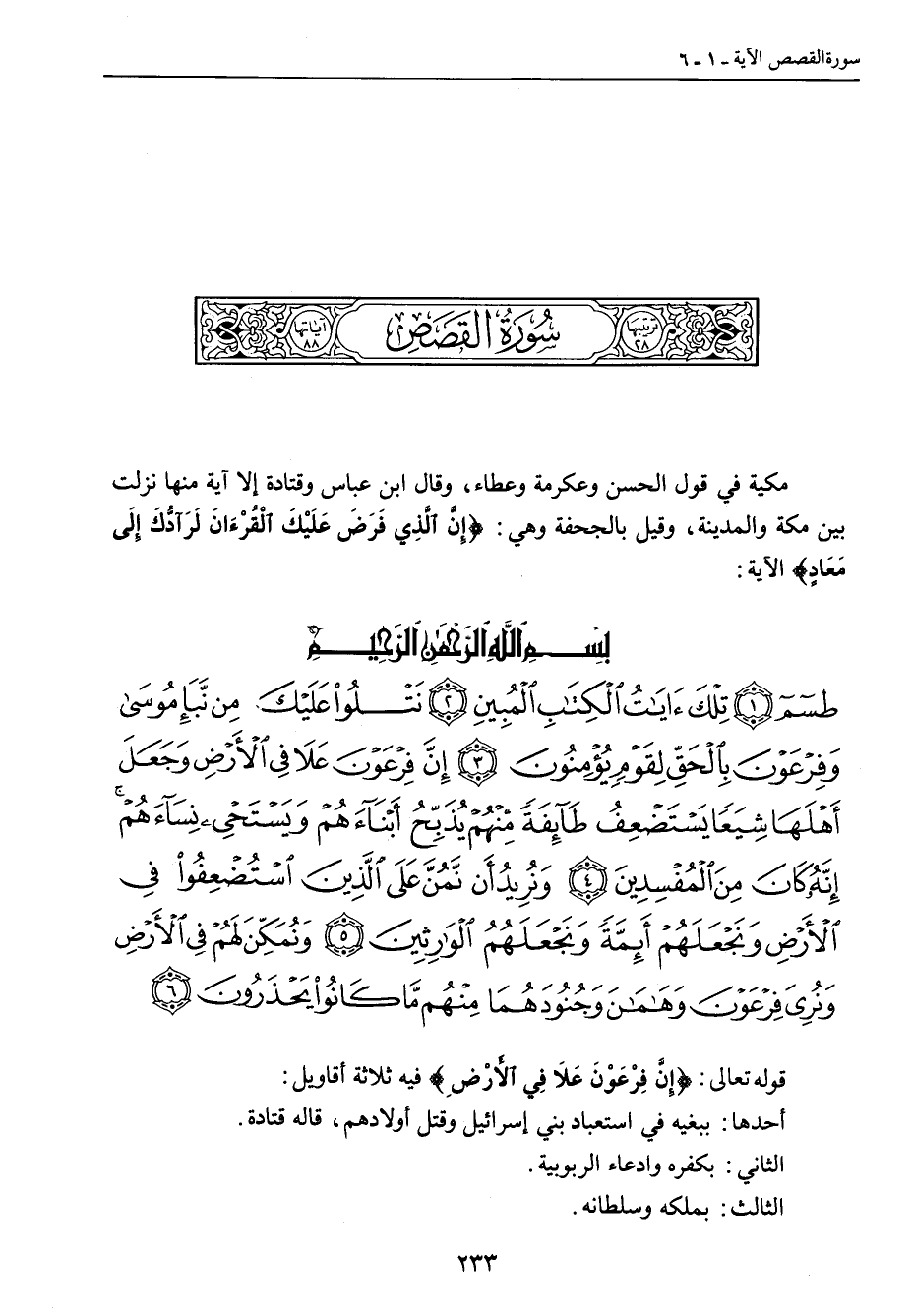 {طسم تلك آيات الكتاب المبين نتلوا عليك من نبإ موسى وفرعون بالحق لقوم يؤمنون إن فرعون علا في الأرض وجعل أهلها شيعا يستضعف طائفة منهم يذبح أبناءهم ويستحيي نساءهم إنه كان من المفسدين ونريد أن نمن على الذين استضعفوا في الأرض ونجعلهم أئمة ونجعلهم الوارثين ونمكن لهم في الأرض ونري فرعون وهامان وجنودهما منهم ما كانوا يحذرون} قوله تعالى: {إِنَّ فِرْعَوْنَ عَلاَ فِي الأَرْضِ} فيه ثلاثة أقاويل: أحدها: ببغيه في استعباد بني إسرائيل وقتل أولادهم , قاله قتادة. الثاني: بكفره وادعاء الربوبية. الثالث: بملكه وسلطانه.