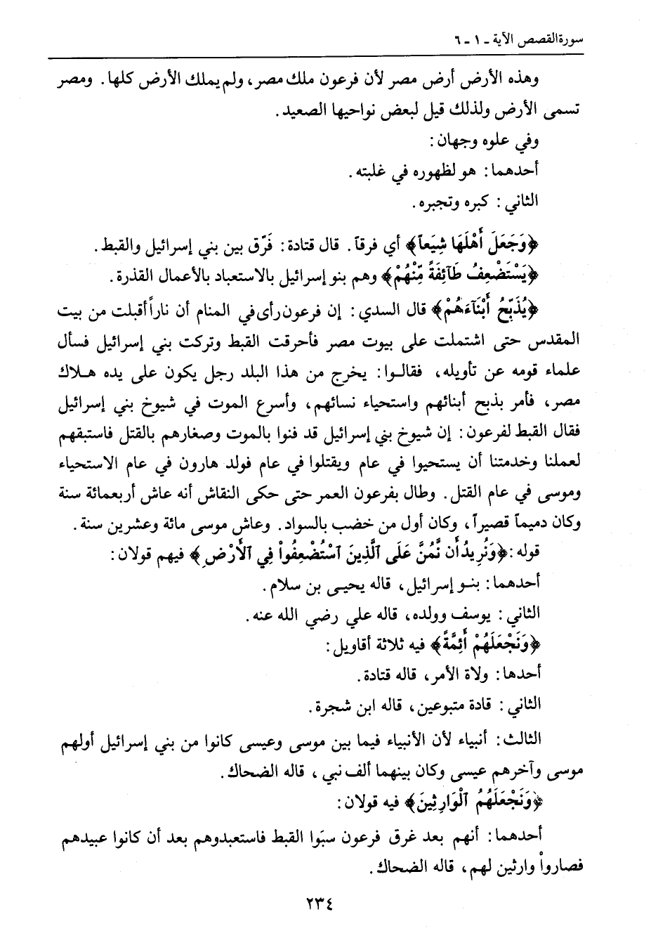 وهذه الأرض أرض مصر لأن فرعون ملك مصر , ولم يملك الأرض كلها , ومصر تسمى الأرض ولذلك قيل لبعض نواحيها الصعيد. وفي علوه وجهان: أحدهما: هو لظهوره في غلبته. الثاني: كبره وتجبره. {وَجَعَلَ أَهْلَهَا شِيَعاً} أي فرقاً. قاله قتادة: فَرّق بين بني إسرائيل والقبط. {يَسْتَضْعِفُ طَآئِفَةً مِّنْهُمْ} وهم بنو إسرائيل بالاستعباد بالأعمال القذرة. {يُذَبِّحُ أَبْنَآءَهُمْ} قال السدي: إن فرعون رأى في المنام أن ناراً أقبلت من بيت المقدس حتى اشتملت على بيوت مصر فأحرقت القبط وتركت بني إسرائيل فسأل علماء قومه عن تأويله , فقالوا: يخرج من هذا البلد رجل يكون على يده هلاك مصر , فأمر بذبح أبنائهم واستحياء نسائهم , وأسرع الموت في شيوخ بني إسرائيل فقال القبط لفرعون: إن شيوخ بني إسرائيل قد فنوا بالموت وصغارهم بالقتل فاستبقهم لعملنا وخدمتنا أن يستحيوا في عام ويقتلوا في عام فولد هارون في عام الاستحياء وموسى في عام القتل. وطال بفرعون العمر حتى حكى النقاش أنه عاش أربعمائة سنة وكان دميماً قصيراً. وكان أول من خضب بالسواد. وعاش موسى مائة وعشرين سنة. قوله: {وَنُرِيدُ أَن نَّمُنَّ عَلَى الَّذِينَ استُضْعِفُواْ فِي الأَرْضِ} فيهم قولان: أحدهما: بنو إسرائيل , قاله يحيى بن سلام. الثاني: يوسف وولده , قاله علي رضي الله عنه. {وَنَجْعَلَهُمْ أَئِمََّةً} فيه ثلاثة أقاويل: أحدها: ولاة الأمر , قاله قتادة. الثاني: قادة متبوعين , قاله قتادة. الثالث: أنبياء لأن الأنبياء فيما بين موسى وعيسى كانوا من بني إسرائيل أولهم موسى وآخرهم عيسى وكان بينهما ألف نبي , قاله الضحاك. {وَنَجْعَلَهُمْ الْوَارِثِينَ} فيه قولان: أحدهما: أنهم بعد غرق فرعون سبَوا القبط فاستعبدوهم بعد أن كانوا عبيدهم فصاروا وارثين لهم، قاله الضحاك.