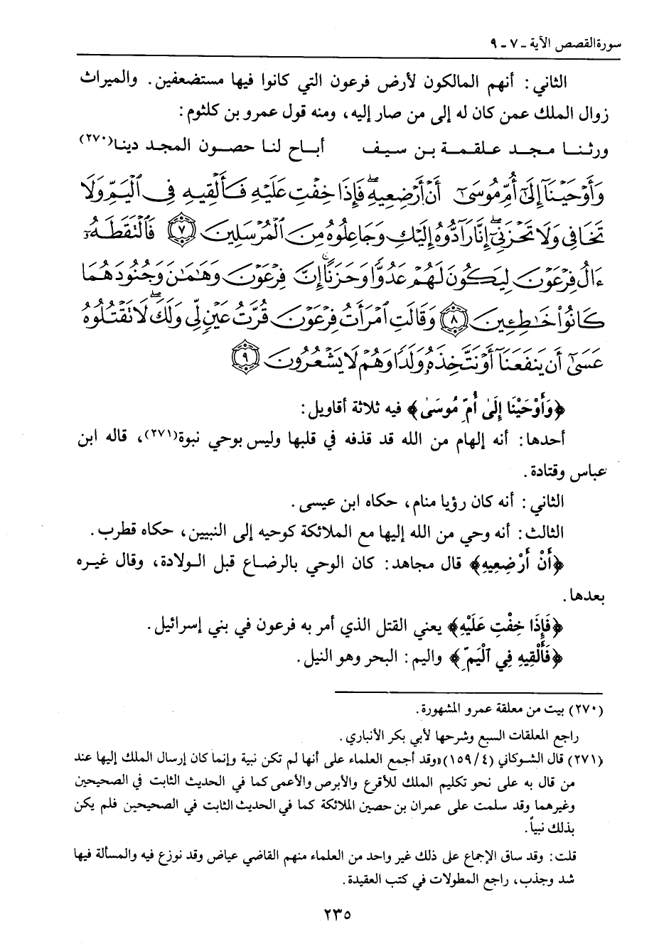 {وأوحينا إلى أم موسى أن أرضعيه فإذا خفت عليه فألقيه في اليم ولا تخافي ولا تحزني إنا رادوه إليك وجاعلوه من المرسلين فالتقطه آل فرعون ليكون لهم عدوا وحزنا إن فرعون وهامان وجنودهما كانوا خاطئين وقالت امرأة فرعون قرة عين لي ولك لا تقتلوه عسى أن ينفعنا أو نتخذه ولدا وهم لا يشعرون} {وَأَوْحَيْنَا إِلَى أُمِّ مُوسَى} فيه ثلاثة أقاويل: أحدها: أنه إلهام من الله قد قذفه في قلبها وليس بوحي نبوة , قاله ابن عباس وقتادة. الثاني: أنه كان رؤيا منام , حكاه ابن عيسى. الثالث: أنه وحي من الله إليها مع الملائكة كوحيه إلى النبيين , حكاه قطرب. {أَنْ أَرْضِعِيه} قال مجاهد: كان الوحي بالرضاع قبل الولادة , وقال غيره بعدها. {فَإِذَا خِفْتِ عَلَيْهِ} يعني القتل الذي أمر به فرعون في بني إسرائيل {فَأَلْقِيهِ فِي الْيَمِّ} واليم: البحر وهو النيل.