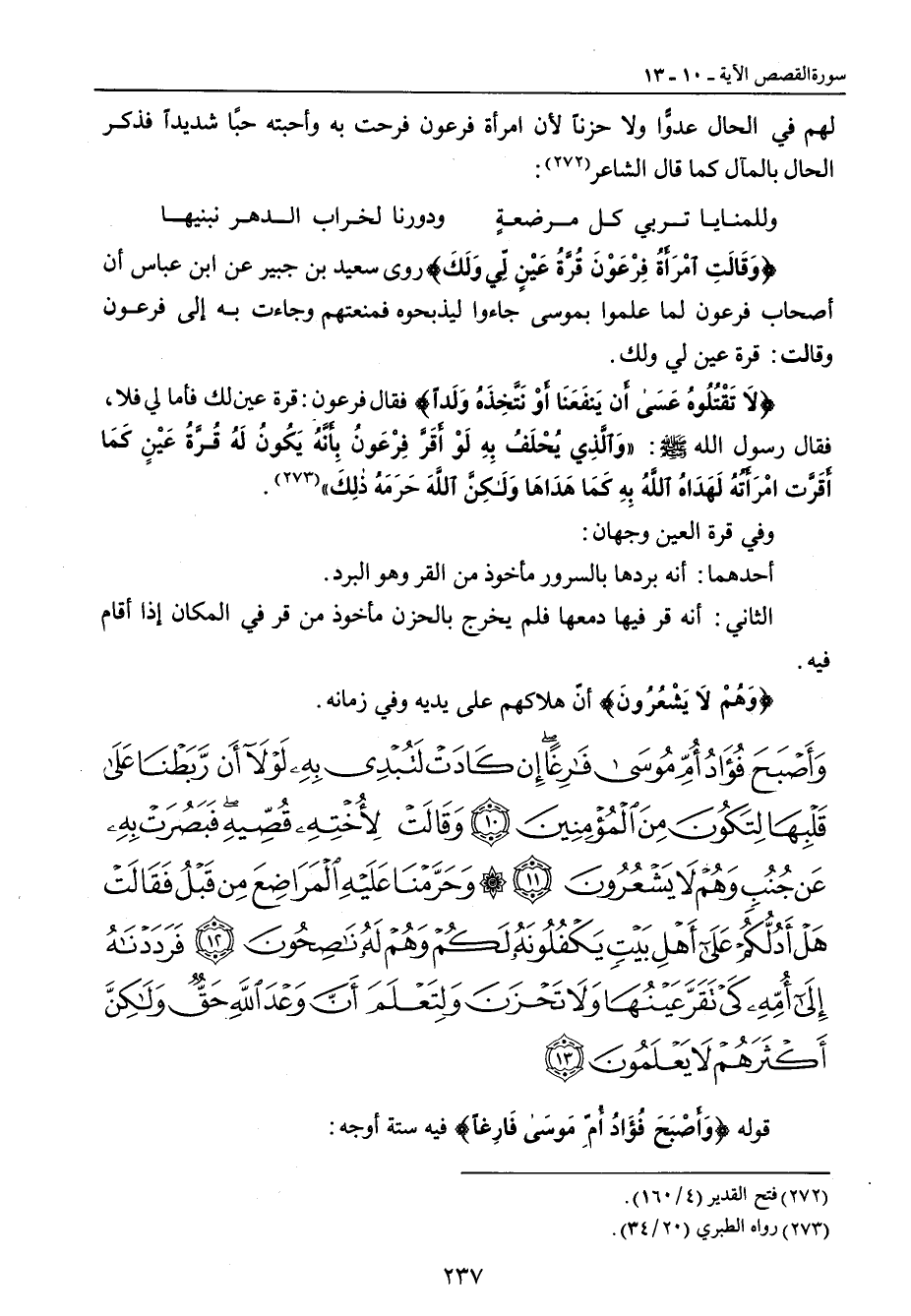 {وَقَالَتِ امْرَأةُ فِرْعَوْنَ قُرَّةُ عَيْنٍ لِّي وَلَكَ} روى سعيد بن جبير عن ابن عباس أن أصحاب فرعون لما علموا بموسى جاءوا ليذبحوه فمنعتهم وجاءت به إلى فرعون وقالت: قرة عين لي ولك. {لاَ تَقْتُلُوهُ عَسَى أَن يَنفَعَنَا أَوْ نَتَّخِذَهُ وَلَداً} فقال فرعون: قرة عين لك فأما لي فلا , فقال رسول الله صلى الله عليه وسلم: (وَالَّذِي يُحْلَفُ بِهِ لَوْ أَقَرَّ فِرْعَونُ بِأَنَّهُ يَكُونُ لَهُ قُرَّةُ عَيْنٍ كَمَا أَقَرَّت امْرَأَتُهُ لَهَدَاهُ اللَّهُ بِهِ كَمَا هَدَاهَا وََلَكِنَّ اللَّهَ حَرَمَهُ ذلِكَ) وفي قرة العين وجهان: أحدهما: أنه بردها بالسرور مأخوذ من القر وهو البرد. الثاني: أنه قر فيها دمعها فلم يخرج بالحزن مأخوذ من قر في المكان إذا أقام فيه. {وَهُمْ لاَ يَشْعُرُونَ} أنّ هلاكهم على يديه وفي زمانه.