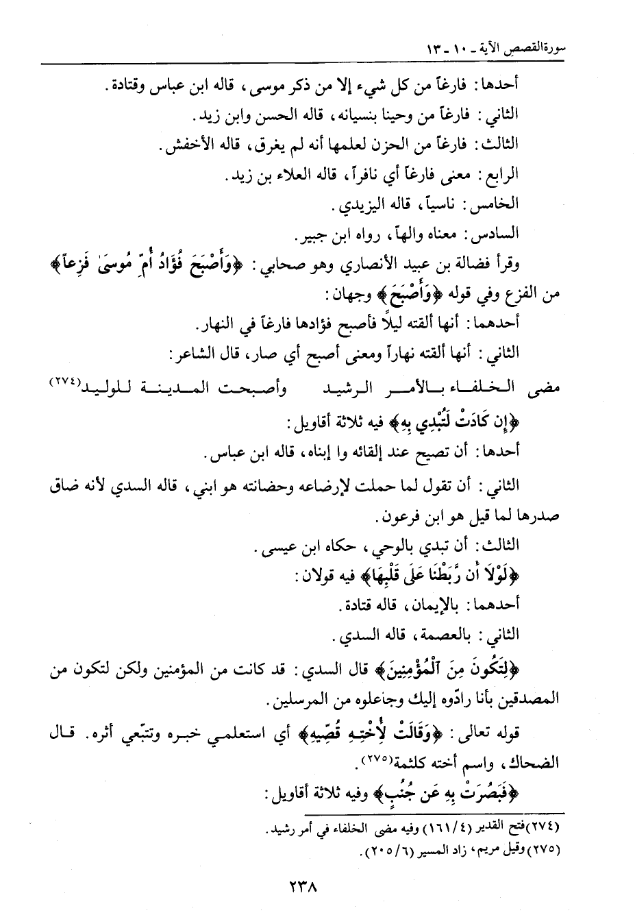 أحدها: فارغاً من كل شيء إلا من ذكر موسى , قاله ابن عباس وقتادة. الثاني: فارغاً من وحينا بنسيانه , قاله الحسن وابن زيد. الثالث: فارغاً من الحزن لعلمها أنه لم يغرق , قاله الأخفش. الرابع: معنى فارغاً أي نافراً , قاله العلاء بن زيد. الخامس: ناسياً , قاله اليزيدي. السادس: معناه والهاً , رواه ابن جبير. وقرأ فضالة بن عبيد الأنصاري وهو صحابي: {وَأَصْبَحَ فُؤَادُ أُمِّ مُوسَى فَزِعاً} من الفزع وفي قوله {وَأَصْبَحَ} وجهان: أحدهما: أنها ألقته ليلاً فأصبح فؤادها فارغاً في النهار. الثاني: أنها ألقته نهاراً ومعنى أصبح أي صار , قال الشاعر: