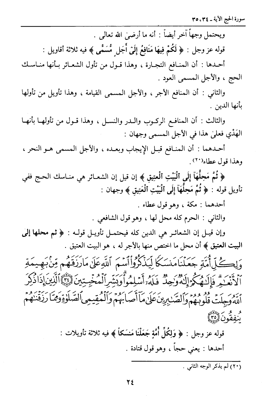 {ولكل أمة جعلنا منسكا ليذكروا اسم الله على ما رزقهم من بهيمة الأنعام فإلهكم إله واحد فله أسلموا وبشر المخبتين الذين إذا ذكر الله وجلت قلوبهم والصابرين على ما أصابهم والمقيمي الصلاة ومما رزقناهم ينفقون} قوله عز وجل: {وَلِكُلِّ أَمَّةٍ جَعَلْنَا مَنسَكاً} فيه ثلاثة تأويلات: أحدها: يعني حجاً , وهو قول قتادة.