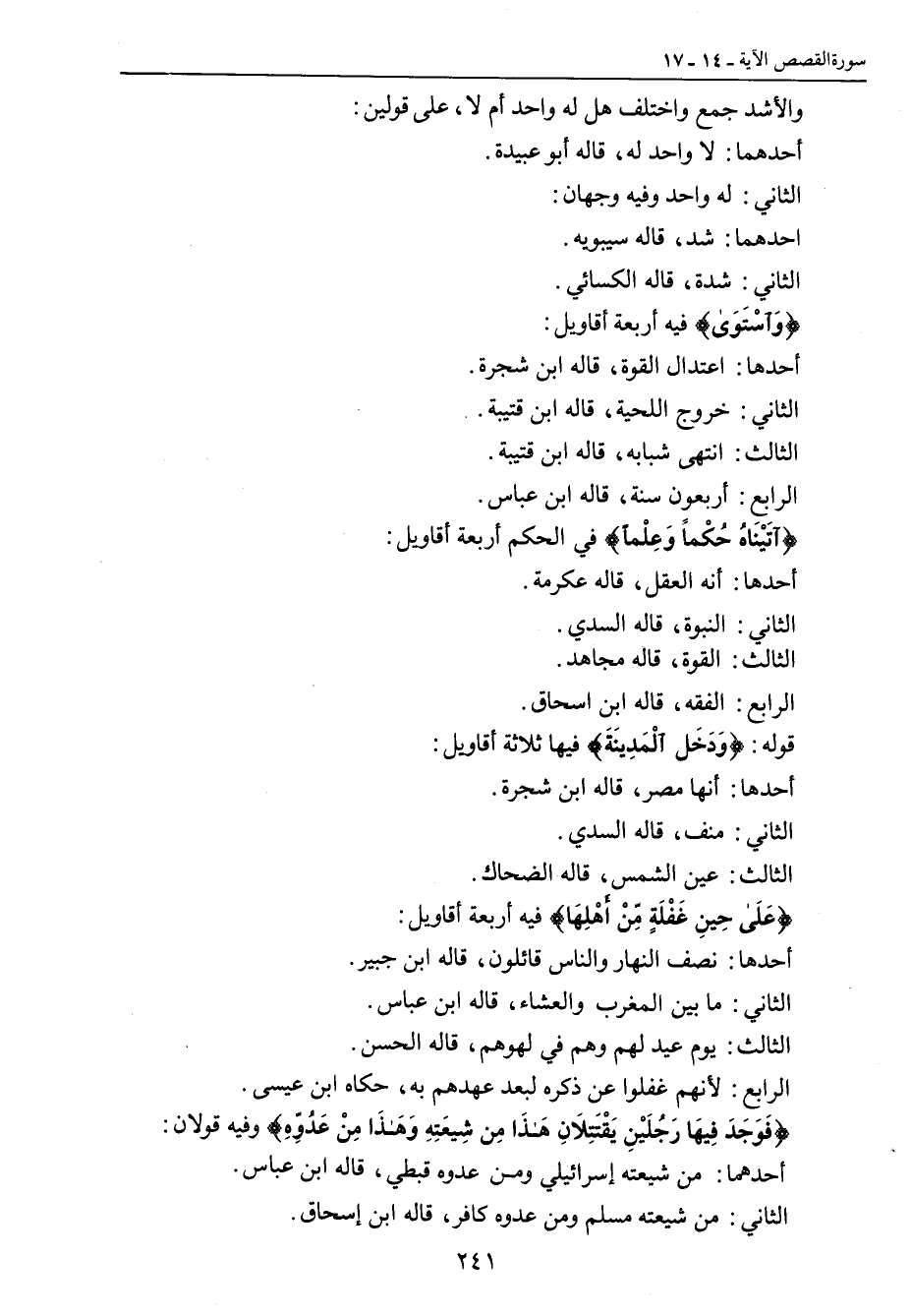 والأشد جمع واختلف هل له واحد أم لا , على قولين: أحدهما: لا واحد له , قاله أبو عبيدة. الثاني: له واحد وفيه وجهان: أحدهما: شد , قاله سيبويه. الثاني: شدة , قاله الكسائي. {وَاسْتَوَى} فيه أربعة أقاويل: أحدها: اعتدال القوة , قاله ابن شجرة. الثاني: خروج اللحية , قاله ابن قتيبة. الثالث: انتهى شبابه , قاله ابن قتيبة. الرابع: أربعون سنة , قاله ابن عباس. {آتَيْنَاهُ حُكْماً وَعِلْماً} في الحكم أربعة أقاويل: أحدها: أنه العقل , قاله عكرمة. الثاني: النبوة , قاله السدي. الثالث: القوة , قاله مجاهد. الرابع: الفقه , قاله ابن اسحاق. قوله: {وَدَخَل الْمَدِينَةَ} فيها ثلاثة أقاويل: أحدها: أنها مصر , قاله ابن شجرة. الثاني: منف , قاله السدي. الثالث: عين الشمس , قاله الضحاك. {عَلَى حِينٍ غَفْلَةٍ مِّنْ أَهْلِهَا} فيه أربعة أقاويل: أحدها: نصف النهار والناس قائلون , قاله ابن جبير. الثاني: ما بين المغرب والعشاء , قاله ابن عباس. الثالث: يوم عيد لهم وهم في لهوهم , قاله الحسن. الرابع: لأنهم غفلوا عن ذكره لبعد عهدهم به , حكاه ابن عيسى. {فَوَجَدَ فِيهَا رَجُلَيْنِ يَقْتَتِلاَنِ هَذَا مِن شِيعَتِهِ وَهَذَا مِنْ عَدُوِّهِ} وفيه قولان: أحدهما: من شيعته إسرائيلي ومن عدوه قبطي، قاله ابن عباس. الثاني: من شيعته مسلم ومن عدوه كافر، قاله ابن إسحاق.