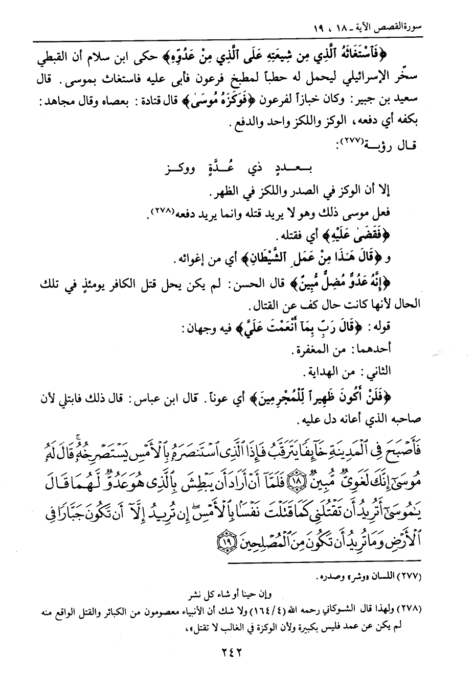 {فاسْتَغَاثَهُ الَّذِي مِن شِيعَتِهِ عَلَى الَّذِي مِنْ عَدُوِّهِ} حكى ابن سلام أن القبطي سخّر الإسرائيلي ليحمل له حطباً لمطبخ فرعون فأبى عليه فاستغاث بموسى. قال سعيد بن جبير: وكان خبازاً لفرعون {فَوَكَزَهُ مُوسَى} قال قتادة: بعصاه وقال مجاهد: بكفه أي دفعه , الوكز واللكز واحد والدفع. قال رؤبة: