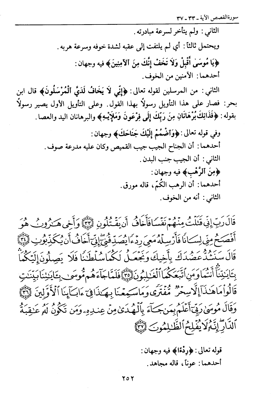 الثاني: ولم يتأخر لسرعة مبادرته. ويحتمل ثالثاً: أي لم يلتفت إلى عقبه لشدة خوفه وسرعة هربه. {يَا مُوسَى أَقْبِلْ وَلاَ تَخَفْ إِنَّكَ مَنَ الآمِنِينَ} فيه وجهان: أحدهما: الآمنين من الخوف. الثاني: من المرسلين لقوله تعالى: {إِنِّي لاَ يَخَافُ لَدَيَّ الْمُرْسَلُونَ} قال ابن بحر: فصار على هذا التأويل رسولاً بهذا القول. وعلى التأويل الأول يصير رسولاً بقوله: {فَذَانِكَ بُرْهَاناَنِ مِنَ رَبِّكَ إلَى فِرْعَونَ وَمَلإِئْهِ} والبرهانان اليد والعصا. وفي قوله تعالى: {وَاضْمُمْ إِلَيْكَ جَنَاحَكَ} وجهان: أحدهما: أن الجناح الجيب جيب القميص وكان عليه مدرعة صوف. الثاني: أن الجيب جنب البدن. {مِنَ الرَّهْبِ} فيه وجهان: أحدهما: أن الرهب الكُمّ , قاله مورق. الثاني: أنه من الخوف.
