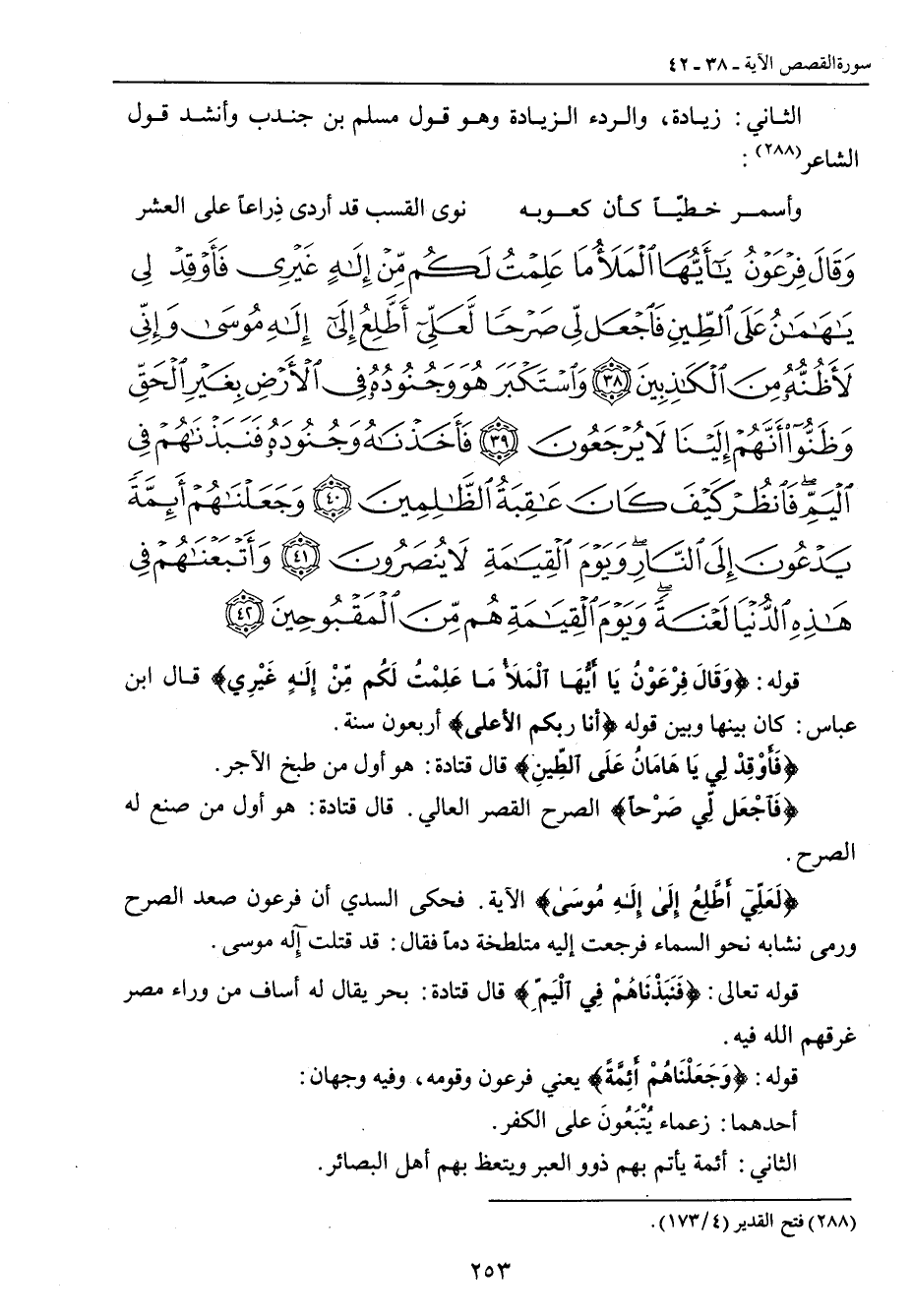 {وقال فرعون يا أيها الملأ ما علمت لكم من إله غيري فأوقد لي يا هامان على الطين فاجعل لي صرحا لعلي أطلع إلى إله موسى وإني لأظنه من الكاذبين واستكبر هو وجنوده في الأرض بغير الحق وظنوا أنهم إلينا لا يرجعون فأخذناه وجنوده فنبذناهم في اليم فانظر كيف كان عاقبة الظالمين وجعلناهم أئمة يدعون إلى النار ويوم القيامة لا ينصرون وأتبعناهم في هذه الدنيا لعنة ويوم القيامة هم من المقبوحين} قوله: {وَقَالَ فِرْعَوْنُ يَا أَيُّهَا الْمَلأُ مَا عَلِمْتُ لَكُم مِّنْ إِلَهٍ غَيْرِي} قال ابن عباس: كان بينها وبين قوله {أنا ربكم الأعلى} أربعون سنة. {فأَوْقِدْ لِي يَا هَامَانَ عَلَى الطِّينِ} قال قتادة: هو أول من طبخ الآجر. {فَاجْعَلَ لِّي صَرْحاً} الصرح القصر العالي. قال قتادة: هو أول من صنع له الصرح. {لَعَلِّي أَطَّلِعُ إِلَى إِلَهِ مُوسَى} الآية. فحكى السدي أن فرعون صعد الصرح ورمى نشابه نحو السماء فرجعت إليه متلطخة دماً: قد قتلت إِله موسى. قوله تعالى: {فَنَبَذْنَاهُمْ فِي الْيَمِّ} قال قتادة: بحر يقال له أساف من وراء مصر غرقهم الله فيه. قوله: {وَجَعَلْنَاهُمْ أَئِمَّةً} يعني فرعون وقومه , وفيه وجهان: أحدهما: زعماء يُتْبَعُونَ على الكفر. الثاني: أئمة يأتم بهم ذوو العبر ويتعظ بهم أهل البصائر.