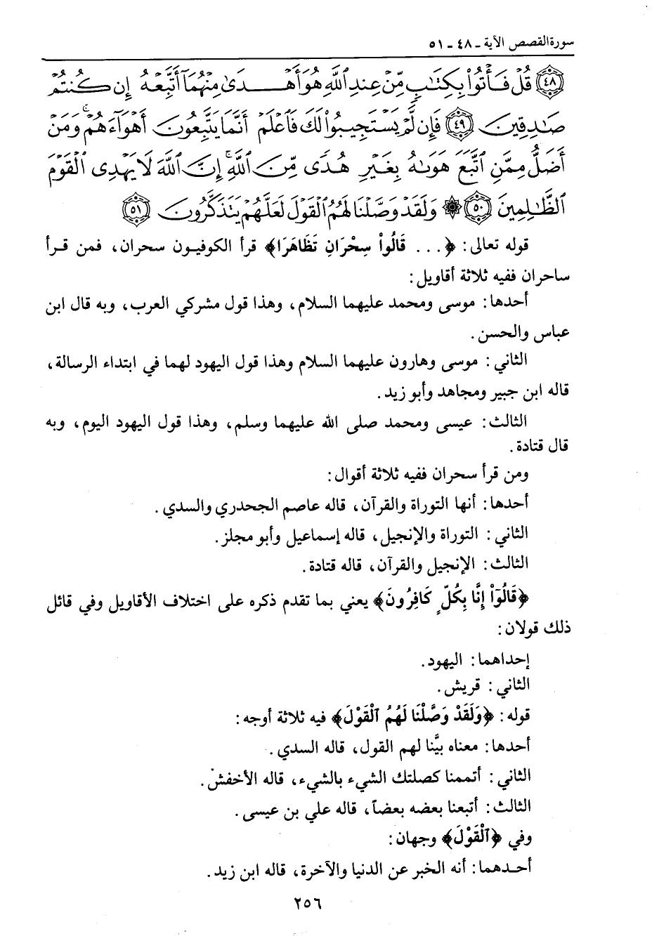 قل فأتوا بكتاب من عند الله هو أهدى منهما أتبعه إن كنتم صادقين فإن لم يستجيبوا لك فاعلم أنما يتبعون أهواءهم ومن أضل ممن اتبع هواه بغير هدى من الله إن الله لا يهدي القوم الظالمين ولقد وصلنا لهم القول لعلهم يتذكرون} قوله تعالى: { ... قَالُواْ سِحْرَانِ تَظَاهَرَا} قرأ الكوفيون سحران , فمن قرأ ساحران ففيه ثلاثة أقاويل: أحدها: موسى ومحمد عليهما السلام , وهذا قول مشركي العرب , وبه قال ابن عباس والحسن. الثاني: موسى وهارون عليهما السلام وهذا قول اليهود لهما في ابتداء الرسالة , قاله ابن جبير ومجاهد وأبو زيد. الثالث: عيسى ومحمد صلى الله عليه وسلم , وهذا قول اليهود اليوم , وبه قال قتادة. ومن قرأ سحران ففيه ثلاثة أقوال: أحدها: أنها التوارة والقرآن , قاله عاصم الجحدري والسدي. الثاني: التوراة والإنجيل، قاله إسماعيل وأبو مجلز. الثالث: الإنجيل والقرآن، قاله قتادة. {قَالُواْ إِنَّا بِكُلٍّ كَافِرُونَ} يعني بما ذكره على اختلاف الأقاويل وفي قائل ذلك قولان: إحداهما: اليهود. الثاني: قريش. قوله: {وَلَقَدْ وَصَّلْنَا لَهُمْ الْقَوْلَ} فيه ثلاثة أوجه: أحدها: معناه بيَّنا لهم القول، قاله السدي. الثالث: أتبعنا بعضه بعضاً، قاله علي بن عيسى. وفي {الْقَوْلَ} وجهان: أحدهما: أن الخبر عن الدنيا والآخرة، قاله ابن زيد.
