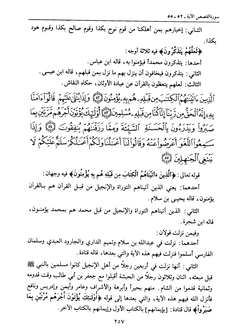 {الذين آتيناهم الكتاب من قبله هم به يؤمنون وإذا يتلى عليهم قالوا آمنا به إنه الحق من ربنا إنا كنا من قبله مسلمين أولئك يؤتون أجرهم مرتين بما صبروا ويدرؤون بالحسنة السيئة ومما رزقناهم ينفقون وإذا سمعوا اللغو أعرضوا عنه وقالوا لنا أعمالنا ولكم أعمالكم سلام عليكم لا نبتغي الجاهلين} قوله تعالى: {الَّذِينَءَآتَيْنَاهُمْ الْكِتَابَ مِن قَبْلِهِ هُم بِهِ يُؤْمِنُونَ} فيه وجهان: أحدهما: يعني الذين آتيناهم التوراة والإنجيل من قبل القرآن هم بالقرآن يؤمنون , قاله يحيى بن سلام. الثاني: الذي آتيناهم التوراة والإنجيل من قبل محمد هم بمحمد يؤمنون , قاله ابن شجرة. وفيمن نزلت قولان: أحدهما: نزلت في عبد الله بن سلام وتميم الداري والجارود العبدي وسلمان الفارسي أسلموا فنزلت فيهم هذه الآية والتي بعدها , قاله قتادة. الثاني: أنها نزلت في أربعين رجلاً من أهل الإنجيل كانوا مسلمين بالنبي صلى الله عليه وسلم قبل مبعثه , اثنان وثلاثون رجلاً من الحبشة أقبلوا مع جعفر بن أبي طالب وقت قدومه وثمانية قدموا من الشام. منهم بحيراً وأبرهة والأشراف وعامر وأيمن وإدريس ونافع فأنزل الله فيهم هذه الآية , والتي بعدها إلى قوله {أُوْلَئِكَ يُؤْتُوْنَ أَجْرَهُم مَّرَّتَيْنِ بِمَا صَبَرُواْ} قال قتادة: [بإيمانهم] بالكتاب الأول وإيمانهم بالكتاب الآخر.