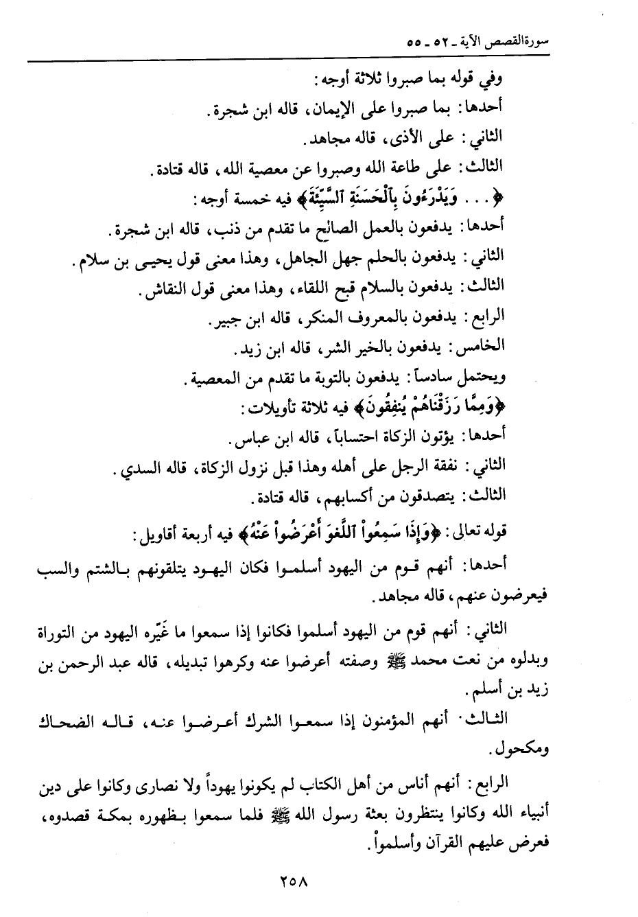 وفي قوله بما صبروا ثلاثة أوجه: أحدها: بما صبروا على الإيمان , قاله ابن شجرة. الثاني: على الأذى , قاله مجاهد. الثالث: على طاعة الله وصبروا عن معصية الله , قاله قتادة. { ... وَيَدْرَءُونَ بِالْحَسَنَةِ السَّيِّئَةَ} فيه خمسة أوجه: أحدها: يدفعون بالعمل الصالح ما تقدم من ذنب , قاله ابن شجرة. الثاني: يدفعون بالحلم جهل الجاهل , وهذا معنى قول يحيى بن سلام. الثالث: يدفعون بالسلام قبح اللقاء , وهذا معنى قول النقاش. الرابع: يدفعون بالمعروف المنكر , قاله ابن جبير. الخامس: يدفعون بالخير الشر , قاله ابن زيد. ويحتمل سادساً: يدفعون بالتوبة ما تقدم من المعصية. {وَمِمَّا رَزَقْنَاهُمْ يُفِقُونَ} فيه ثلاثة تأويلات: أحدها: يؤتون الزكاة احتساباً , قاله ابن عباس. الثاني: نفقة الرجل على أهله وهذا قبل نزول الزكاة , قاله السدي. الثالث: يتصدقون من أكسابهم , قاله قتادة. قوله تعالى: {وَإِذَا سَمِعُواْ اللَّغوَ أَعْرَضُواْ عَنْهُ} فيه أربعة أقاويل: أحدها: أنهم قوم من اليهود أسلموا فكان اليهود يتلقونهم بالشتم والسب فيعرضون عنهم , قاله مجاهد. الثاني: أنهم قوم من اليهود أسلموا فكانوا إذا سمعوا ما غَيّره اليهود من التوراة وبدلوه من نعت محمد صلى الله عليه وسلم وصفته أعرضوا عنه وكرهوا تبديله , قاله عبد الرحمن بن زيد بن أسلم. الثالث: أنهم المؤمنون إذا سمعوا الشرك أعرضوا عنه , قاله الضحاك ومكحول. الرابع: أنهم أناس من أهل الكتاب لم يكونوا يهوداً ولا نصارى وكانوا على دين أنبياء الله وكانوا ينتظرون بعثة رسول الله صلى الله عليه وسلم فلما سمعوا بظهوره بمكة قصدوه , فعرض عليهم القرآن وأسلمواْ.