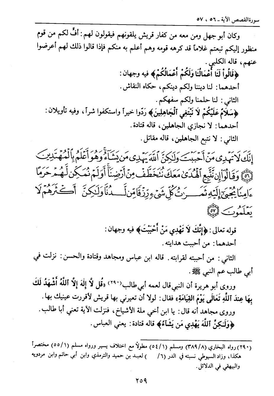 {إنك لا تهدي من أحببت ولكن الله يهدي من يشاء وهو أعلم بالمهتدين وقالوا إن نتبع الهدى معك نتخطف من أرضنا أو لم نمكن لهم حرما آمنا يجبى إليه ثمرات كل شيء رزقا من لدنا ولكن أكثرهم لا يعلمون} قوله تعالى: {إِنَّكَ لاَ تَهْدِي مَنْ أَحْبَبْتَ} فيه وجهان: أحدهما: من أحببت هدايته. الثاني: من أحببته لقرابته , قاله ابن عباس ومجاهد وقتادة والحسن: نزلت في أبي طالب عم الرسول صلى الله عليه وسلم. وروى أبو هريرة أن النبي قال لعمه أبي طالب (قُل لاَّ إِلَهَ إِلاَّ اللَّهُ أَشْهَدُ لَكَ بِهَا عِندَ اللَّهِ تَعَالَى يَوْمَ القِيَامَةِ) فقال: لولا أن تعيرني بها قريش لأقررت عينيك بها. وروى مجاهد أنه قال: يا ابن أخي ملة الأشياخ , فنزلت الآية تعني أبا طالب. {وَلَكِنَّ اللَّهَ يَهْدِي مَن يَشَآءُ} قاله قتادة: يعني العباس.