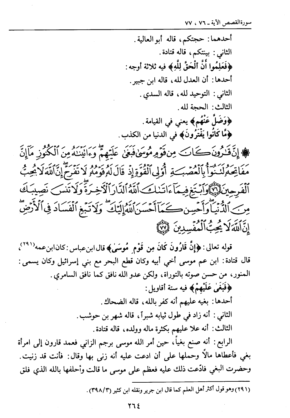 {إن قارون كان من قوم موسى فبغى عليهم وآتيناه من الكنوز ما إن مفاتحه لتنوء بالعصبة أولي القوة إذ قال له قومه لا تفرح إن الله لا يحب الفرحين وابتغ فيما آتاك الله الدار الآخرة ولا تنس نصيبك من الدنيا وأحسن كما أحسن الله إليك ولا تبغ الفساد في الأرض إن الله لا يحب المفسدين} قوله تعالى: {إِنَّ قَارُونَ كَانَ مِن قَوْمِ مُوسَى} قال ابن عباس: كان ابن عمه , قاله قتادة: ابن عم موسى أخي أبيه وكان قطع البحر مع بني إسرائيل وكان يسمى: المنور , من حسن صوته بالتوراة , ولكن عدو الله نافق كما نافق السامري. {فَبَغَى عَلَيْهِمْ} فيه ستة أقاويل: أحدها: بغيه عليهم أنه كفر بالله , قاله الضحاك. الثاني: أنه زاد في طول ثيابه شبراً , قاله شهر بن حوشب. الثالث: أنه علا عليهم بكثرة ماله وولده , قاله قتادة. الرابع: أنه صنع بغياً , حين أمر الله موسى برجم الزاني فعمد قارون إلى امرأة بغي فأعطاها مالاً وحملها على أن ادعت عليه أنه زنى بها وقال: فأنت قد زنيت. وحضرت البغي فادّعت ذلك عليه فعظم على موسى ما قالت وأحلفها بالله الذي فلق