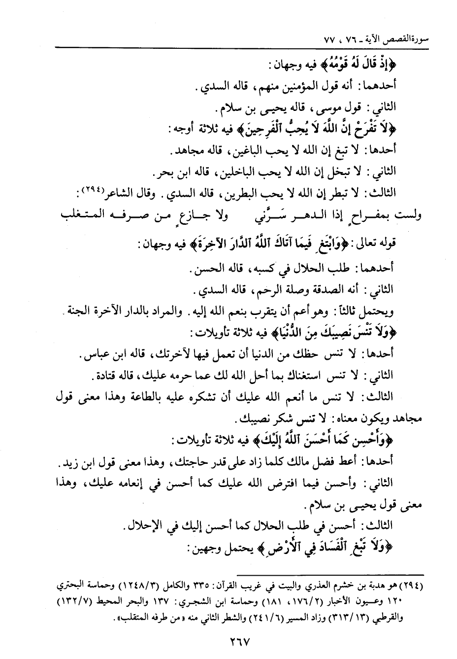 {إذْ قَالَ لَهُ قَوْمُهُ} فيه وجهان: أحدهما: أنه قول المؤمنين منهم , قاله السدي. الثاني: قول موسى , قاله يحيى بن سلام. {لاَ تَفْرَحْ إنَّ اللَّهَ لاَ يُحِبُّ الْفَرِحِينَ} فيه ثلاثة أوجه: أحدها: لا تبغ إن الله لا يحب الباغين , قاله مجاهد. الثاني: لا تبخل إن الله لا يحب الباخلين , قاله ابن بحر. الثالث: لا تبطر إن الله لا يحب البطرين , قاله السدي , وقال الشاعر: