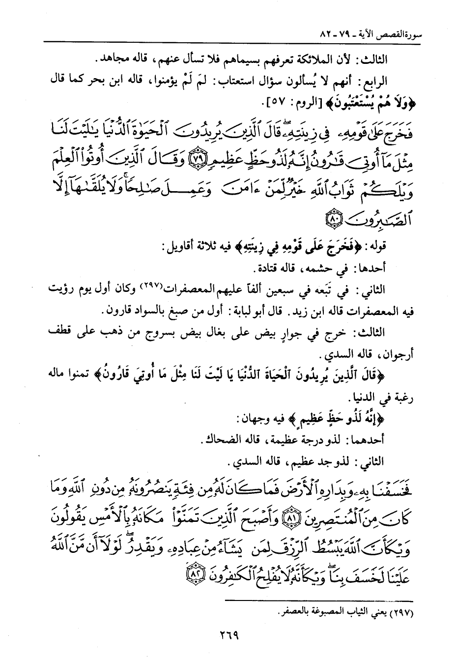 {فخرج على قومه في زينته قال الذين يريدون الحياة الدنيا يا ليت لنا مثل ما أوتي قارون إنه لذو حظ عظيم وقال الذين أوتوا العلم ويلكم ثواب الله خير لمن آمن وعمل صالحا ولا يلقاها إلا الصابرون} قوله: {فَخَرَجَ عَلَى قَوْمِهِ فِي زِينَتِهِ} فيه ثلاثة أقاويل: أحدها: في حشمه , قاله قتادة. الثاني: في تَبَعه في سبعين ألفاً عليهم المعصفرات وكان أول يوم رؤيت فيه المعصفرات قاله ابن زيد , قال أبو لبابة: أول من صبغ بالسواد قارون. الثالث: خرج في جوارٍ بيض على بغال بيض بسروج من ذهب على قطف أرجوان , قاله السدي. {قَالَ الَّذِينَ يُرِيدُونَ الْحَيَاةَ الدُّنْيَا يَا لَيْتَ لَنَا مِثْلَ مَا أُوتِيَ قَارُونَ} تمنوا ماله رغبة في الدنيا. {إنَّهُ لَذُو حَظٍّ عَظِيمٍ} فيه وجهان: أحدهما: لذو درجة عظيمة , قاله الضحاك. الثاني: لذو جد عظيم , قاله السدي.