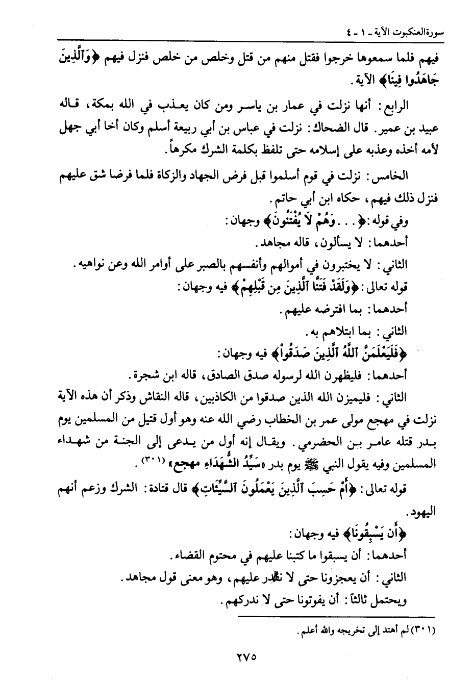فيهم فلما سمعها خرجوا فقتل منهم من قتل وخلص من خلص فنزل فيهم {وَالَّذِينَ جَاهَدُوا فِينَا} الآية. الرابع: أنها نزلت في عمار بن ياسر ومن كان يعذب في الله بمكة , قاله عبيد بن عمير. قال الضحاك: نزلت في عباس بن أبي ربيعة أسلم وكان أخا أبي جهل لأمه أخذه وعذبه على إسلامه حتى تلفظ بكلمة الشرك مكرهاً. الخامس: نزلت في قوم أسلموا قبل فرض الجهاد والزكاة فلما فرضا شق عليهم فنزل ذلك فيهم , حكاه ابن أبي حاتم. وفي قوله: { ... وَهُمْ لاَ يُفْتَنُونَ} وجهان: أحدهما: لا يسألون , قاله مجاهد. الثاني: لا يختبرون في أموالهم وأنفسهم بالصبر على أوامر الله وعن نواهيه. قوله تعالى: {وَلَقَدْ فَتَنَّا الَّذِينَ مِن قَبْلِهِمْ} فيه وجهان: أحدهما: بما افترضه عليهم. الثاني: بما ابتلاهم به. {فََيَعْلَمَنَّ اللَّهُ الَّذِينَ صَدَقُواْ} فيه وجهان: أحدهما: فليظهرن الله لرسوله صدق الصادق , قاله ابن شجرة. الثاني: فليميزن الله الذين صدقوا من الكاذبين , قاله النقاش وذكر أن هذه الآية نزلت في مهجع مولى عمر بن الخطاب رضي الله عنه وهو أول قتيل من المسلمين يوم بدر قتله عامر ابن الحضرمي , ويقال إنه أول من يدعى إلى الجنة من شهداء المسلمين وفيه يقول النبي صلى الله عليه وسلم يوم بدر (سَيِّدُ الشُّهَدَاءِ مهجع). قوله تعالى: {أَمْ حَسِبَ الَّذِينَ يَعْمَلُونَ السَّيِّئَاتِ} قال قتادة: الشرك وزعم أنهم اليهود. {أَن يَسْبِقُونَا} فيه وجهان: أحدهما: أن يسبقوا ما كتبنا عليهم في محتوم القضاء. الثاني: أن يعجزونا حتى لا نقدر عليهم , وهو معنى قول مجاهد. ويحتمل ثالثاً: أن يفوتونا حتى لا ندركهم.
