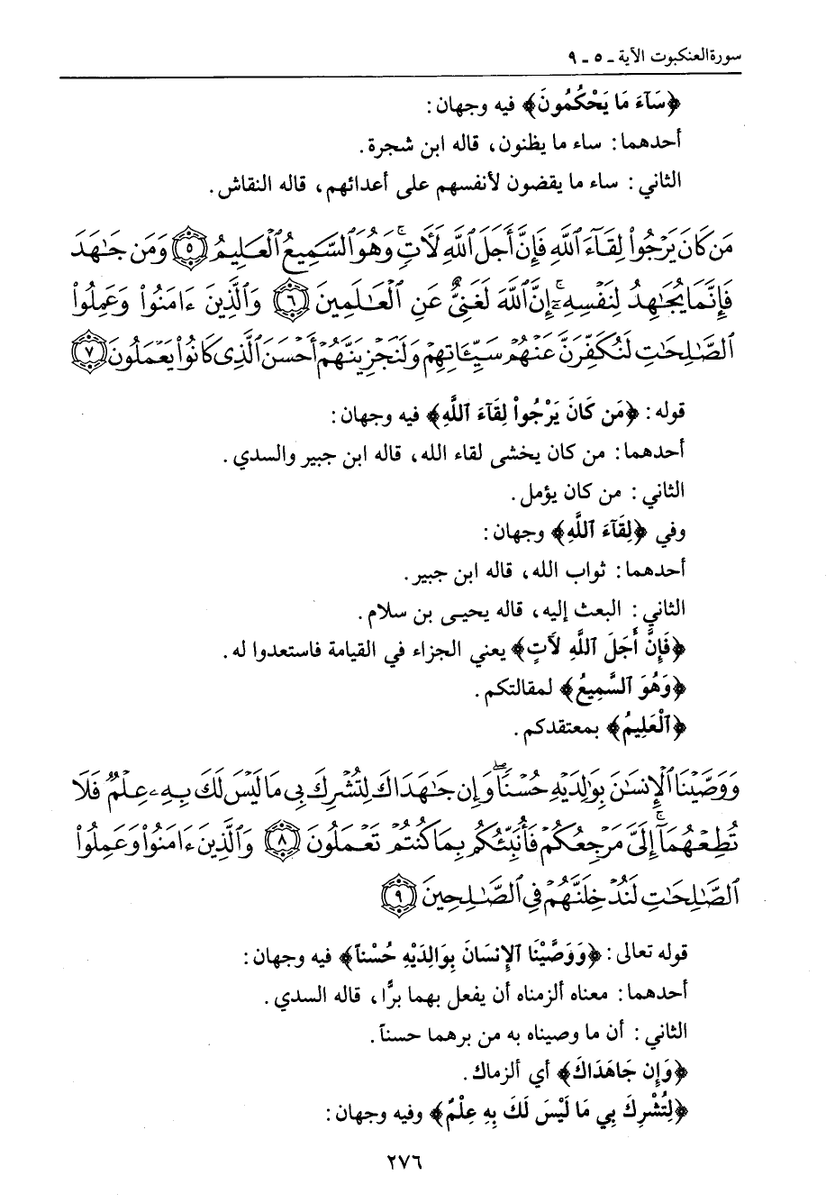 {ووصينا الإنسان بوالديه حسنا وإن جاهداك لتشرك بي ما ليس لك به علم فلا تطعهما إلي مرجعكم فأنبئكم بما كنتم تعملون والذين آمنوا وعملوا الصالحات لندخلنهم في الصالحين} قوله تعالى: {وَوَصَّيْنَا الإِنسَانَ بِوَالِدَيْهِ حُسْناً} فيه وجهان: أحدهما: معناه ألزمناه أن يفعل بهما برّاً , قاله السدي. الثاني: أن ما وصيناه به من برهما حسناً. {وَإِن جَاهَدَاكَ} أي ألزماك. {لِتُشْرِكَ بِي مَا لَيْسَ لَكَ بِهِ عِلْمٌ} وفيه وجهان: