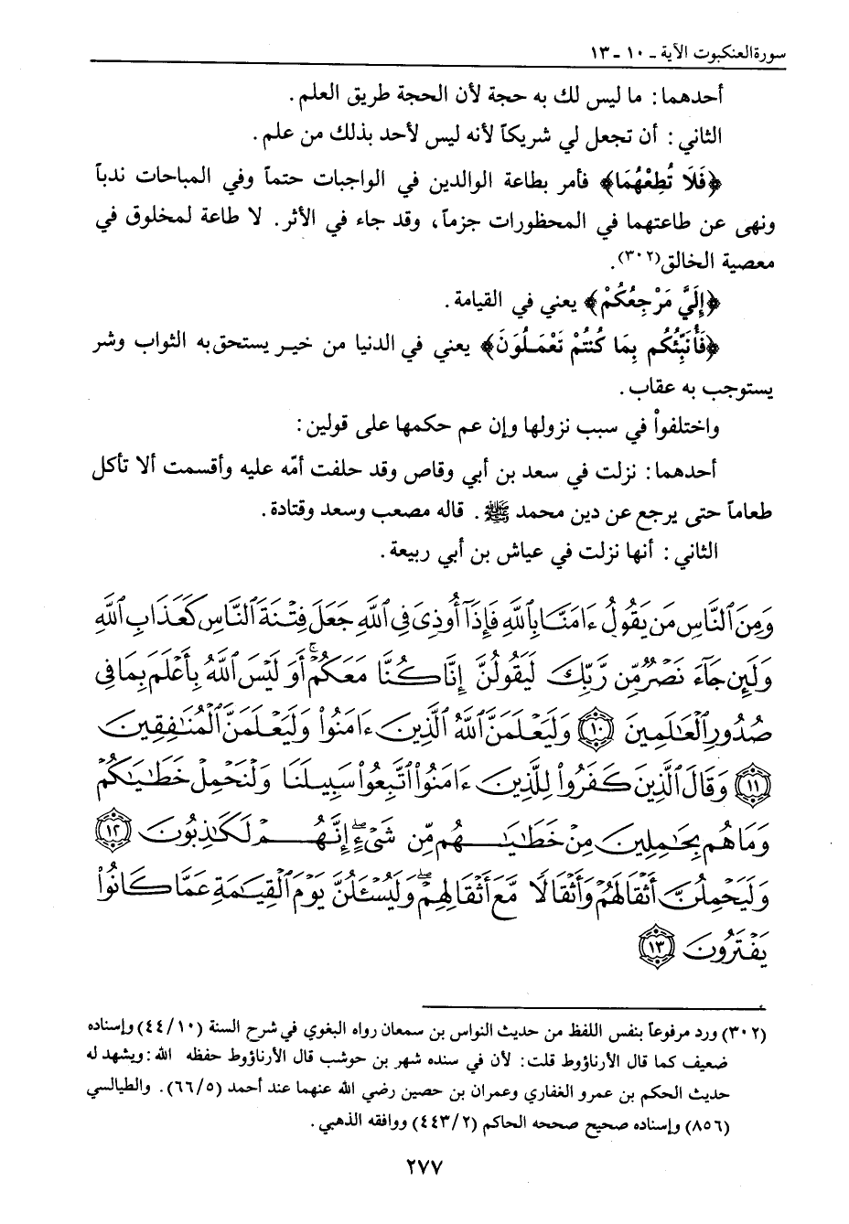 أحدهما: ما ليس لك به حجة لأن الحجة طريق العلم. الثاني: أن تجعل لي شريكاً لأنه ليس لأحد بذلك من علم. {فَلاَ تُطِعْهُمَا} فأمر بطاعة الوالدين في الواجبات حتماً وفي المباحات ندباً ونهى عن طاعتهما في المحظورات جزماً , وقد جاء في الأثر. لا طاعة لمخلوق في معصية الخالق. {إِلَيَّ مَرْجِعُكُمْ} يعني في القيامة. {فَأُنَبِّئُكُمْ بِمَا كُنتُمْ تَعْمَلُونَ} يعني في الدنيا من خير يستحق به الثواب وشر يستوجب به عقاب. واختلفواْ في سبب نزولها وإن عم حكمها على قولين: أحدهما: نزلت في سعد بن أبي وقاص وقد حلفت أمّه عليه وأقسمت ألا تأكل طعاماً حتى يرجع عن دين محمد صلى الله عليه وسلم. قاله مصعب وسعد وقتادة. الثاني: أنها نزلت في عياش بن أبي ربيعة.