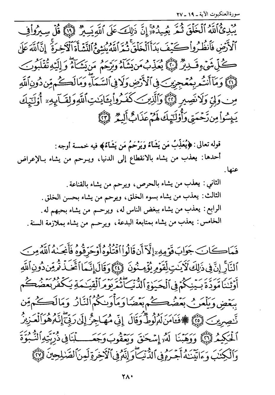 يبدئ الله الخلق ثم يعيده إن ذلك على الله يسير قل سيروا في الأرض فانظروا كيف بدأ الخلق ثم الله ينشئ النشأة الآخرة إن الله على كل شيء قدير يعذب من يشاء ويرحم من يشاء وإليه تقلبون وما أنتم بمعجزين في الأرض ولا في السماء وما لكم من دون الله من ولي ولا نصير والذين كفروا بآيات الله ولقائه أولئك يئسوا من رحمتي وأولئك لهم عذاب أليم} قوله تعالى: {يُعَذِّبُ مَن يَشَآءُ وَيَرْحَمُ مَن يَشَآءُ} فيه خمسة أوجه: أحدها: يعذب من يشاء بالانقطاع إلى الدنيا , ويرحم من يشاء بالإعراض عنها. الثاني: يعذب من يشاء بالحرص , ويرحم من يشاء بالقناعة. الثالث: يعذب من يشاء بسوء الخلق , ويرحم من يشاء بحسن الخلق. الرابع: يعذب من يشاء ببغض الناس له , ويرحم من يشاء بحبهم له. الخامس: يعذب من يشاء بمتابعة البدعة , ويرحم من يشاء بملازمة السنة.