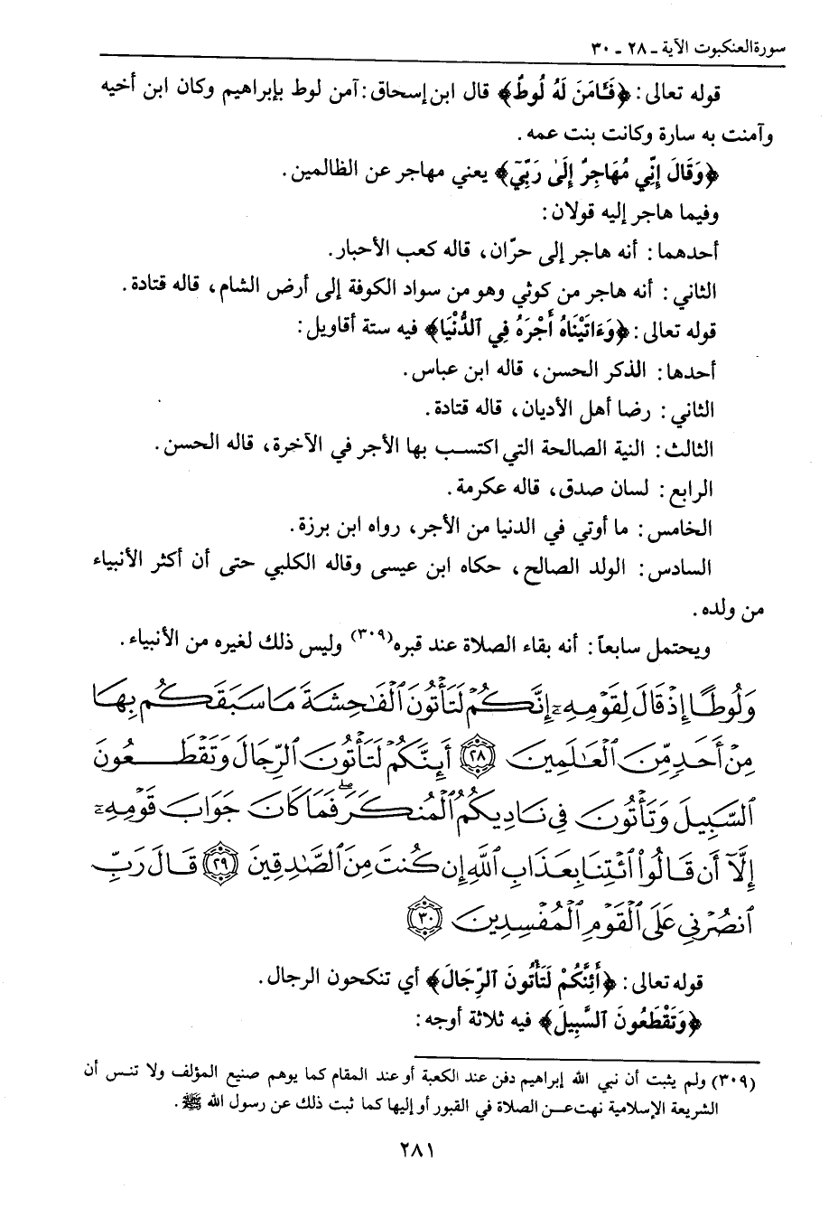 {ولوطا إذ قال لقومه إنكم لتأتون الفاحشة ما سبقكم بها من أحد من العالمين أئنكم لتأتون الرجال وتقطعون السبيل وتأتون في ناديكم المنكر فما كان جواب قومه إلا أن قالوا ائتنا بعذاب الله إن كنت من الصادقين قال رب انصرني على القوم المفسدين} قوله تعالى: {أَئِنَّكُمْ لَتَأْتُونَ الرِّجَالَ} أي تنكحون الرجال. {وَتَقْطَعُونَ السَّبِيلَ} فيه ثلاثة أوجه:
