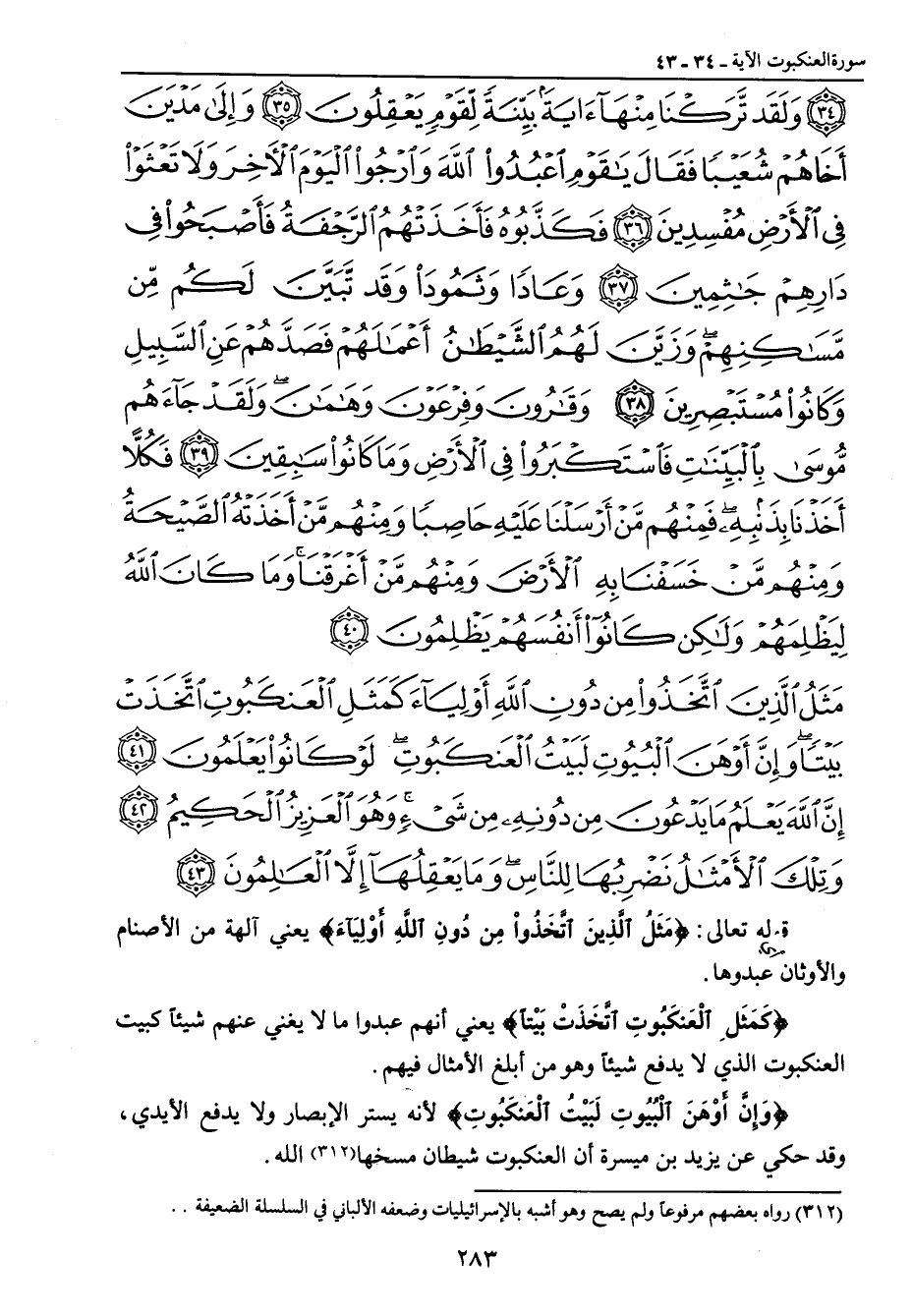 ولقد تركنا منها آية بينة لقوم يعقلون وإلى مدين أخاهم شعيبا فقال يا قوم اعبدوا الله وارجوا اليوم الآخر ولا تعثوا في الأرض مفسدين فكذبوه فأخذتهم الرجفة فأصبحوا في دارهم جاثمين وعادا وثمود وقد تبين لكم من مساكنهم وزين لهم الشيطان أعمالهم فصدهم عن السبيل وكانوا مستبصرين وقارون وفرعون وهامان ولقد جاءهم موسى بالبينات فاستكبروا في الأرض وما كانوا سابقين فكلا أخذنا بذنبه فمنهم من أرسلنا عليه حاصبا ومنهم من أخذته الصيحة ومنهم من خسفنا به الأرض ومنهم من أغرقنا وما كان الله ليظلمهم ولكن كانوا أنفسهم يظلمون مثل الذين اتخذوا من دون الله أولياء كمثل العنكبوت اتخذت بيتا وإن أوهن البيوت لبيت العنكبوت لو كانوا يعلمون إن الله يعلم ما يدعون من دونه من شيء وهو العزيز الحكيم وتلك الأمثال نضربها للناس وما يعقلها إلا العالمون} قوله تعالى: {مَثَلُ الَّذِينَ اتَّخَذُواْ مِن دُونِ اللَّهِ أَوْلِيَآءَ} يعني آلهة من الأصنام والأوثان عبدوها. {كَمَثَلِ الْعَنكَبُوتِ اتَّخَذَتْ بَيْتاً} يعني أنهم عبدوا ما لا يغني عنهم شيئاً كبيت العنكبوت الذي لا يدفع شيئاً وهو من أبلغ الأمثال فيهم. {وَإِنَّ أَوْهَنَ الْبُيُوتِ لَبَيْتُ الْعَنكَبُوتِ} لأنه يستر الإبصار ولا يدفع الأيدي , وقد حكي عن يزيد بن ميسرة أن العنكبوت شيطان مسخها الله.
