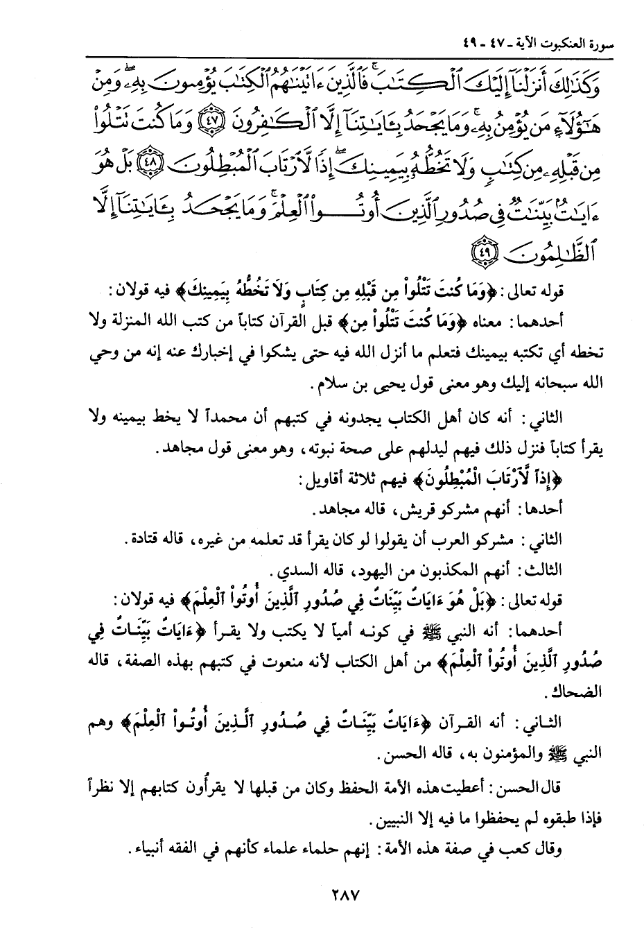 {وكذلك أنزلنا إليك الكتاب فالذين آتيناهم الكتاب يؤمنون به ومن هؤلاء من يؤمن به وما يجحد بآياتنا إلا الكافرون وما كنت تتلو من قبله من كتاب ولا تخطه بيمينك إذا لارتاب المبطلون بل هو آيات بينات في صدور الذين أوتوا العلم وما يجحد بآياتنا إلا الظالمون} قوله تعالى: {وَمَا كُنتَ تَتْلُواْ مِن قَبْلِهِ مِن كِتَابٍ وَلاَ تَخُطُّهُ بِيَمِينِكَ} فيه قولان: أحدهما: معناه {وَمَا كُنتَ تَتْلُواْ مِن} قبل القرآن كتاباً من كتب الله المنزلة ولا تخطه أي تكتبه بيمينك فتعلم ما أنزل الله فيه حتى يشكوا في إخبارك عنه إنه من وحي الله سبحانه إليك وهو معنى قول يحيى بن سلام. الثاني: أنه كان أهل الكتاب يجدونه في كتبهم أن محمداً لا يخط بيمينه ولا يقرأ كتاباً فنزل ذلك فيهم ليدلهم على صحة نبوته , وهو معنى قول مجاهد. {إِذَاً لارْتَابَ الْمُبْطِلُونَ} فيهم ثلاثة أقاويل: أحدها: أنهم مشركو قريش , قاله مجاهد. الثاني: مشركو العرب أن يقولوا لو كان يقرأ قد تعلمه من غيره , قاله قتادة. الثالث: أنهم المكذبون من اليهود , قاله السدي. قوله تعالى: {بَلْ هُوَءَايَاتٌ بَيِّنَاتٌ فِي صُدُورِ الَّذِينَ أُوتُواْ الْعِلْمَ} فيه قولان: أحدهما: أنه النبي صلى الله عليه وسلم في كونه أمياً لا يكتب ولا يقرأ {ءَايَاتٌ بَيِّنَاتٌ فِي صُدُورِ الَّذِينَ أُوتُواْ الْعِلْمَ} من أهل الكتاب لأنه منعوت في كتبهم بهذه الصفة , قاله الضحاك. الثاني: أنه القرآن {ءَايَاتٌ بَيِّنَاتٌ فِي صُدُورِ الَّذِينَ أُوتُواْ الْعِلْمَ} وهم النبي صلى الله عليه وسلم والمؤمنون به , قاله الحسن. قال الحسن: أعطيت هذه الأمة الحفظ وكان من قبلها لا يقرأُون كتابهم إلا نظراً فإذا طبقوه لم يحفظوا ما فيه إلا النبيين. وقال كعب في صفة هذه الأمة: إنهم حلماء علماء كأنهم في الفقه أنبياء.