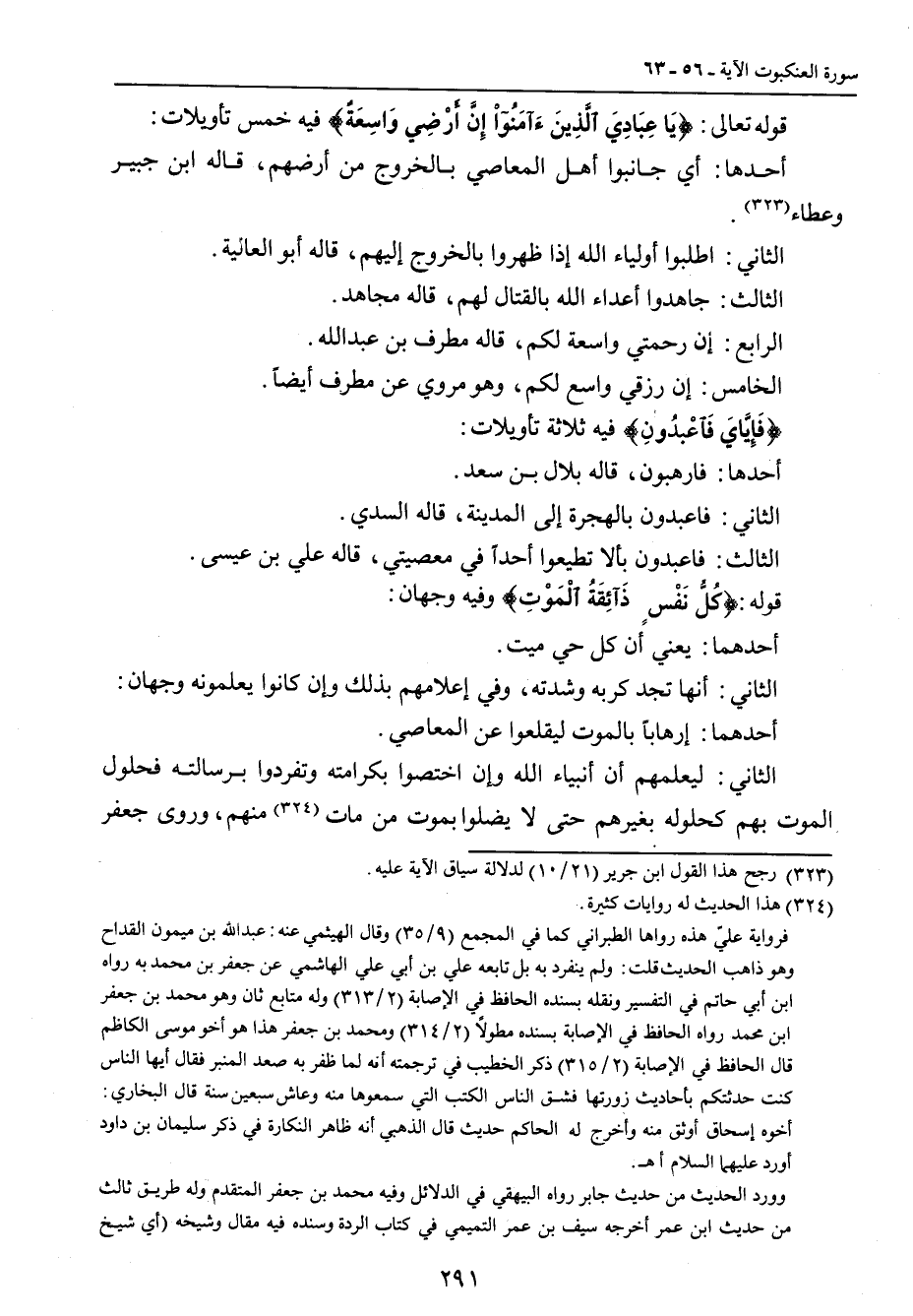 قوله تعالى: {يَا عِبَادِيَ الَّذِينَءَآمَنُواْ إِنَّ أَرْضِي وَاسِعَةٌ} فيه خمسة تأويلات: أحدها: أي جانبوا أهل المعاصي بالخروج من أرضهم , قاله ابن جبير وعطاء. الثاني: اطلبوا أولياء الله إذا ظهروا بالخروج إليهم , قاله أبو العالية. الثالث: جاهدوا أعداء الله بالقتال لهم , قاله مجاهد. الرابع: إن رحمتي واسعة لكم , قاله مطرف بن عبد الله. الخامس: إن رزقي واسع لكم , وهو مروي عن مطرف أيضاً. {فَإِيَّايَ فَاعْبدُونِ} فيه ثلاثة تأويلات: أحدها: فارهبون , قاله بلال بن سعد. الثاني: فاعبدون بالهجرة إلى المدينة , قاله السدي. الثالث: فاعبدون بألا تطيعوا أحداً في معصيتي , قاله علي بن عيسى. قوله: {كُلُّ نَفْسٍ ذَآئِقَةُ الْمَوْتِ} وفيه وجهان: أحدهما: يعني أن كل حي ميت. الثاني: أنها تجد كربه وشدته , وفي إعلامهم بذلك وإن كانوا يعلمونه وجهان: أحدهما: إرهاباً بالموت ليقلعوا عن المعاصي. الثاني: ليعلمهم أن أنبياء الله وإن اختصوا بكرامته وتفردوا برسالته فحلول الموت بهم كحلوله بغيرهم حتى لا يضلوا بموت من مات منهم , وروى جعفر