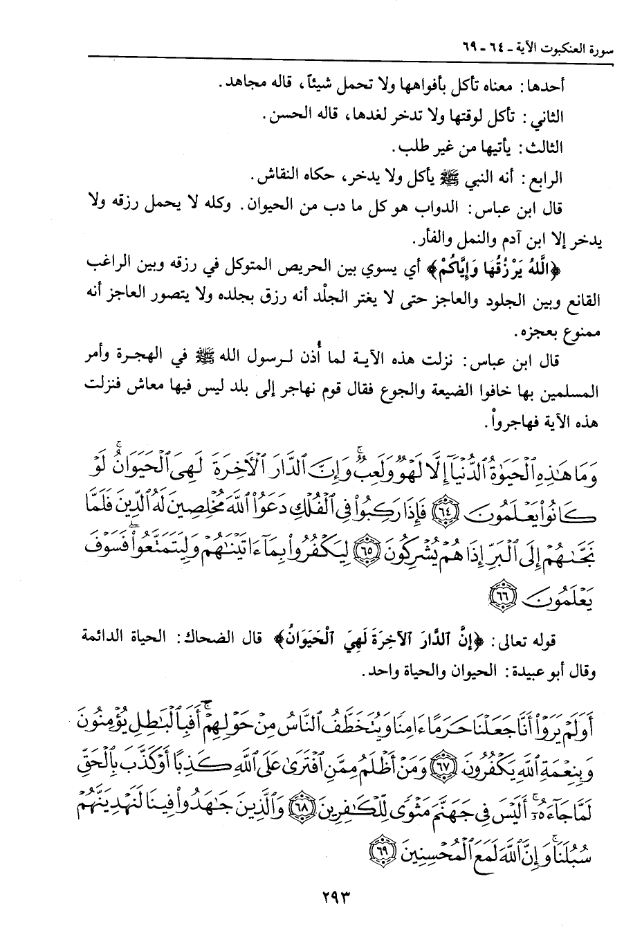 أحدها: معناه تأكل بأفواهها ولا تحمل شيئاً , قاله مجاهد. الثاني: تأكل لوقتها ولا تدخر لغدها , قاله الحسن. الثالث: يأتيها من غير طلب. الرابع: أنه النبي صلى الله عليه وسلم يكل ولا يدخر , حكاه النقاش. قال ابن عباس: الدواب هو كل ما دب من الحيوان. وكله لا يحمل رزقه ولا يدخر إلا ابن آدم والنمل والفأر. {اللَّهُ يَرْزُقُهَا وَإِيَّاكُمْ} أي يسوي بين الحريص المتوكل في رزقه وبين الراغب القانع وبين الجلود والعاجز حتى لا يغتر الجلْد أنه رزق بجلده ولا يتصور العاجز أنه ممنوع بعجزه. قال ابن عباس: نزلت هذه الآية لما أُذن لرسول الله صلى الله عليه وسلم في الهجرة وأمر المسلمين بها خافوا الضيعة والجوع فقال قوم نهاجر إلى بلد ليس فيها معاش فنزلت هذه الآية فهاجرواْ.