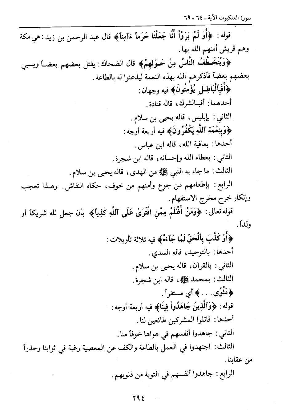 قوله: {أَوَ لَمْ يَرَوْاْ أَنَّا جَعَلْنَا حَرَماًءَآمِناً} قال عبد الرحمن بن زيد: هي مكة وهم قريش أمنهم الله بها. {وَيُتَخَطَّفُ النَّاسُ مِنْ حَوْلِهِمْ} قال الضحاك: يقتل بعضهم بعضاً ويسبي بعضهم بعضاً فأذكرهم الله بهذه النعمة ليذعنوا له بالطاعة. {أَفَبِالْبَاطِلِ يُؤْمِنُونَ} فيه وجهان: أحدهما: أفبالشرك , قاله قتادة. الثاني: بإبليس , قاله يحيى بن سلام. {وَبِنِعْمَةِ اللَّهِ يَكْفُرُونَ} فيه أربعة أوجه: أحدها: بعافية الله , قاله ابن عباس. الثاني: بعطاء الله وإحسانه , قاله ابن شجرة. الثالث: ما جاء به النبي صلى الله عليه وسلم من الهدى , قاله يحيى بن سلام. الرابع: بإطعامهم من جوع وأمنهم من خوف , حكاه النقاش , وهذا تعجب وإنكار خرج مخرج الاستفهام. قوله تعالى: {وَمَنْ أَظْلَمُ مِمَّنِ افْتَرَى عَلَى اللَّهِ كَذِباً} بأن جعل لله شريكاً أو ولداً. {أَوْ كَذَّبَ بِالْحَقِّ لَمَّا جَآءَهُ} فيه ثلاثة تأويلات: أحدها: بالتوحيد , قاله السدي. الثاني: بالقرآن , قاله يحيى بن سلام. الثالث: بمحمد صلى الله عليه وسلم , قاله ابن شجرة. {مَثْوًى ... } أي مستقراً. قوله: {وَالَّذِينَ جَاهَدُواْ فِينَا} فيه أربعة أوجه: أحدها: قاتلوا المشركين طائعين لنا. الثاني: جاهدوا أنفسهم في هواها خوفاً منا. الثالث: اجتهدوا في العمل بالطاعة والكف عن المعصية رغبة في ثوابنا وحذراً من عقابنا. الرابع: جاهدوا أنفسهم في التوبة من ذنوبهم.