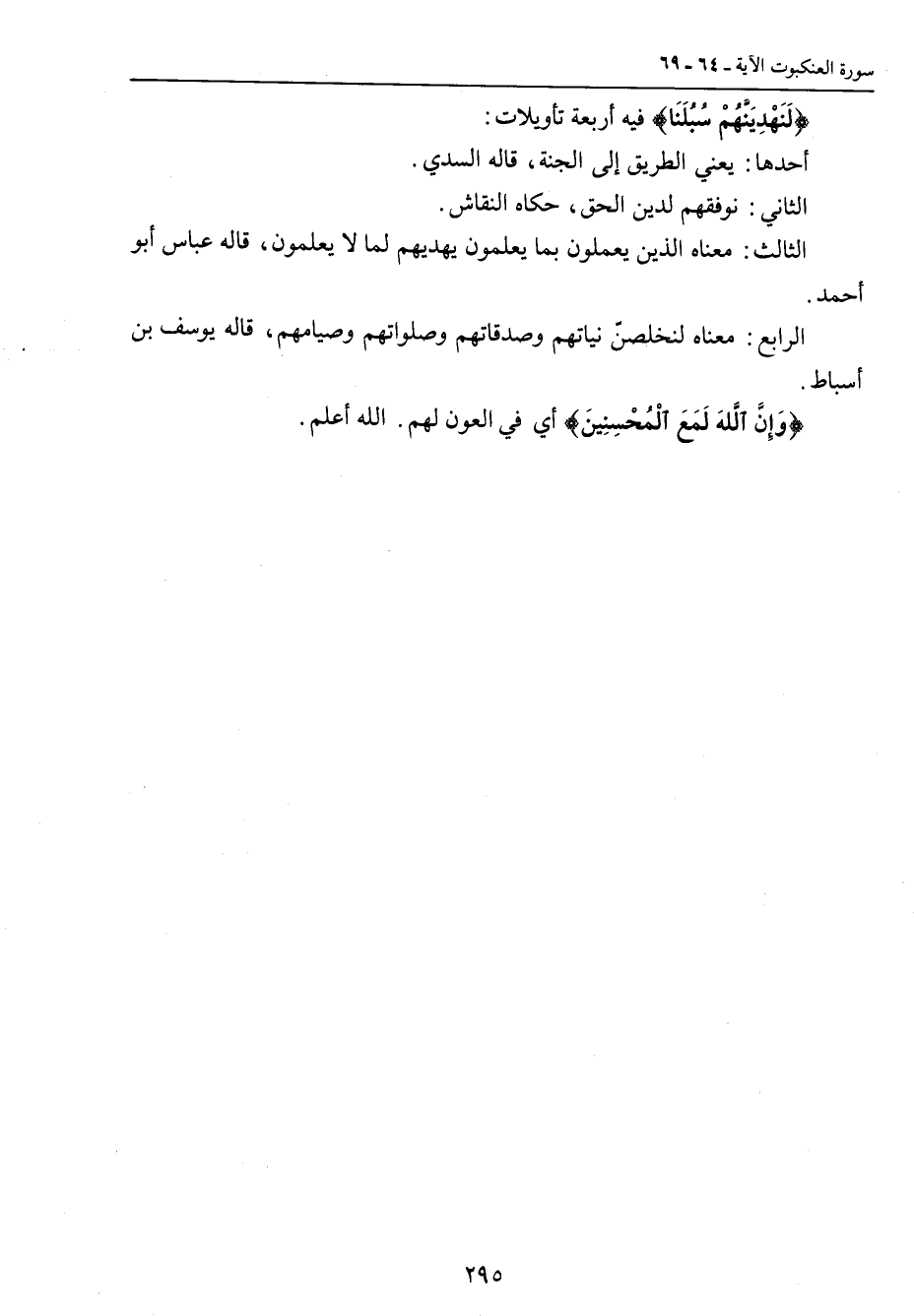 {لَنَهْدِيَنَّهُمْ سُبُلَنَا} فيه أربعة تأويلات: أحدها: يعني الطريق إلى الجنة , قاله السدي. الثاني: نوفقهم لدين الحق , حكاه النقاش. الثالث: معناه الذين يعملون بما يعلمون يهديهم لما لا يعلمون , قاله عباس أبو أحمد. الرابع: معناه لنخلصنّ نياتهم وصدقاتهم وصلواتهم وصيامهم , قاله يوسف بن أسباط. {وَإِنَّ اللَّهَ لَمَعَ الْمُحْسِنِينَ} أي في العون لهم , الله أعلم.