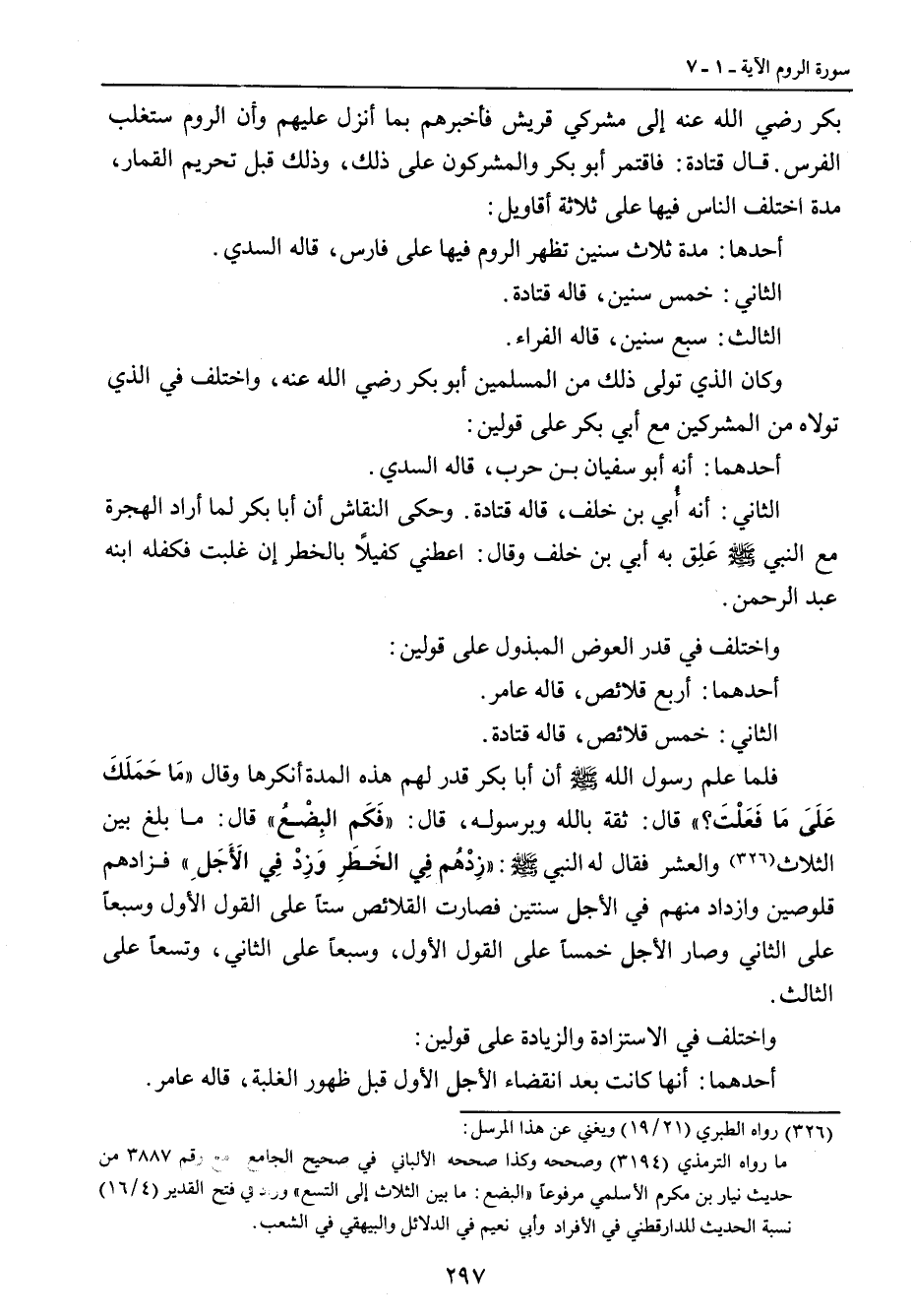 بكر رضي الله عنه إلى مشركي قريش فأخبرهم بما أنزل عليهم وأن الروم ستغلب الفرس. قال قتادة: فاقتمر أبو بكر والمشركون على ذلك , وذلك قبل تحريم القمار مدة اختلف الناس فيها على ثلاثة أقاويل: أحدها: مدة ثلاث سنين تظهر الروم فيها على فارس , قاله السدي. الثاني: خمس سنين , قاله قتادة. الثالث: سبع سنين , قاله الفراء. وكان الذي تولى ذلك من المسلمين أبو بكر رضي الله عنه , واختلف في الذي تولاه من المشركين مع أبي بكر على قولين: أحدهما: أنه أبو سفيان بن حرب , قاله السدي. الثاني: أنه أُبي بن خلف , قاله قتادة. وحكىالنقاش أن أبا بكر لما أراد الهجرة مع النبي صلى الله عليه وسلم عَلِق به أبي بن خلف وقال: اعطني كفيلاً بالخطر إن غلبت فكفله ابنه عبد الرحمن. واختلف في قدر العوض المبذول على قولين: أحدهما: أربع قلائص , قاله عامر. الثاني: خمس قلائص , قاله قتادة. فلما علم رسول الله صلى الله عليه وسلم أن أبا بكر لهم هذه المدة أنكرها وقال: (مَا حَمَلَكَ عَلَىَ مَا فَعَلْتَ؟) قال: ثقة بالله وبرسوله , قال: (فَكَم البِضْعُ) قال: ما بلغ بين الثلاث والعشر فقال له النبي صلى الله عليه وسلم: (زِدْهُم فِي الخَطَرِ فِي وَزِدْ الأَجَلِ) فزادهم قلوصين وازداد منهم في الأجل سنتين فصارت القلائص ستاً على القول الأول , وسبعاً على الثاني , وصار الأجل خمساً على القول الأول , وسبعاً على الثاني: وتسعاً على الثالث. واختلف في الاستزاده والزيادة على قولين: أحدهما: أنها كانت بعد انقضاء الأجل الأول قبل ظهور الغلبة، قاله عامر.